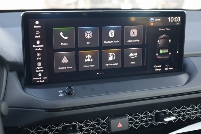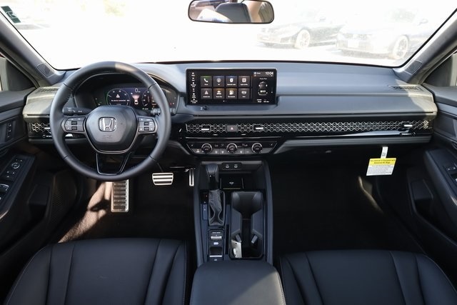 This Accord Hybrid is well equipped with 2.0L I4 DOHC 16V, 4-Wheel Disc Brakes, 8 Speakers, ABS brakes, Adaptive Cruise Control: Adaptive Cruise Control (ACC) with Low-Speed Follow, Air Conditioning, Alloy wheels, AM/FM radio, Apple CarPlay/Android Auto, Auto High-beam Headlights, Automatic temperature control, Blind Spot Information (BSI) System warning, Brake assist, Bumpers: body-color, Compass, Delay-off headlights, Driver door bin, Driver vanity mirror, Dual front impact airbags, Dual front side impact airbags, Electronic Stability Control, Emergency communication system: HondaLink, Exterior Parking Camera Rear, Four wheel independent suspension, Front anti-roll bar, Front Bucket Seats, Front Center Armrest, Front dual zone A/C, Front reading lights, Fully automatic headlights, Heated Front Bucket Seats, Heated front seats, Illuminated entry, Knee airbag, Lane departure: Lane Keeping Assist System (LKAS) active, Leather Shift Knob, Leather steering wheel, Leather-Trimmed Seat Trim, Low tire pressure warning, Memory seat, Occupant sensing airbag, Outside temperature display, Overhead airbag, Overhead console, Panic alarm, Passenger door bin, Passenger vanity mirror, Power door mirrors, Power driver seat, Power moonroof, Power passenger seat, Power steering, Power windows, Radio data system, Radio: 180-Watt Audio System, Rear anti-roll bar, Rear reading lights, Rear seat center armrest, Rear side impact airbag, Rear window defroster, Remote keyless entry, Security system, Speed control, Speed-sensing steering, Speed-Sensitive Wipers, Split folding rear seat, Spoiler, Steering wheel mounted audio controls, Telescoping steering wheel, Tilt steering wheel, Traction control, Trip computer, Variably intermittent wipers, and Wheels: 19" x 8.5J Matte Berlina Black.