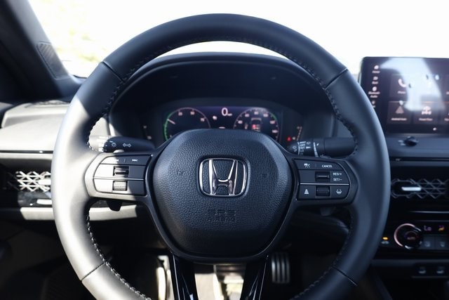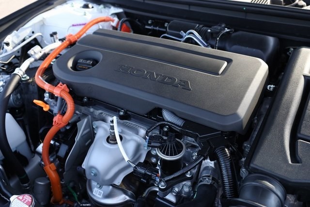 This Accord Hybrid is well equipped with 2.0L I4 DOHC 16V, 4-Wheel Disc Brakes, 8 Speakers, ABS brakes, Adaptive Cruise Control: Adaptive Cruise Control (ACC) with Low-Speed Follow, Air Conditioning, Alloy wheels, AM/FM radio, Apple CarPlay/Android Auto, Auto High-beam Headlights, Automatic temperature control, Blind Spot Information (BSI) System warning, Brake assist, Bumpers: body-color, Compass, Delay-off headlights, Driver door bin, Driver vanity mirror, Dual front impact airbags, Dual front side impact airbags, Electronic Stability Control, Emergency communication system: HondaLink, Exterior Parking Camera Rear, Fabric Seat Trim, Four wheel independent suspension, Front anti-roll bar, Front Bucket Seats, Front Center Armrest, Front dual zone A/C, Front reading lights, Fully automatic headlights, Heated Front Bucket Seats, Heated front seats, Illuminated entry, Knee airbag, Lane departure: Lane Keeping Assist System (LKAS) active, Leather Shift Knob, Leather steering wheel, Low tire pressure warning, Occupant sensing airbag, Outside temperature display, Overhead airbag, Overhead console, Panic alarm, Passenger door bin, Passenger vanity mirror, Power door mirrors, Power driver seat, Power moonroof, Power steering, Power windows, Radio data system, Radio: 180-Watt Audio System, Rear anti-roll bar, Rear reading lights, Rear seat center armrest, Rear side impact airbag, Rear window defroster, Remote keyless entry, Security system, Speed control, Speed-sensing steering, Speed-Sensitive Wipers, Split folding rear seat, Spoiler, Steering wheel mounted audio controls, Telescoping steering wheel, Tilt steering wheel, Traction control, Trip computer, Variably intermittent wipers, and Wheels: 19" x 8.5J Berlina Black.