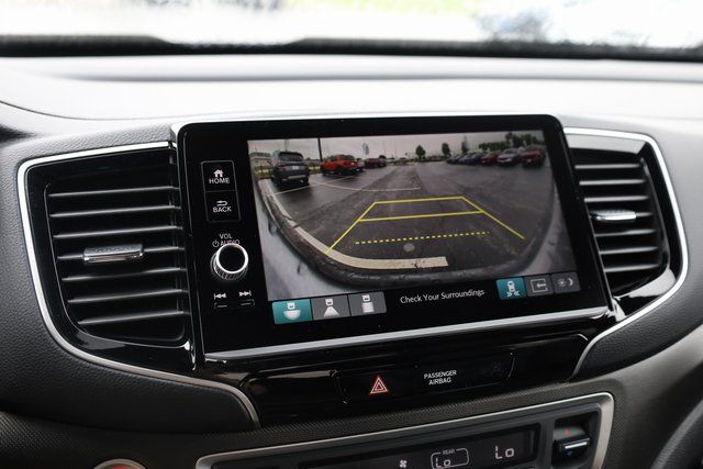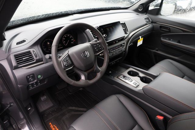 This Ridgeline is well equipped with Black Leather, 4-Wheel Disc Brakes, 4.33 Axle Ratio, 7 Speakers, ABS brakes, Air Conditioning, Alloy wheels, AM/FM radio: SiriusXM, Auto-dimming Rear-View mirror, Automatic temperature control, Blind Spot Information (BSI) System warning, Bluetooth® Hands-Free Link, Brake assist, Bumpers: body-color, Compass, Delay-off headlights, Driver door bin, Driver vanity mirror, Driver's Seat Mounted Armrest, Dual front impact airbags, Dual front side impact airbags, Electronic Stability Control, Emergency communication system: HondaLink Assist, Exterior Parking Camera Rear, Four wheel independent suspension, Front anti-roll bar, Front Bucket Seats, Front dual zone A/C, Front fog lights, Front reading lights, Fully automatic headlights, Garage door transmitter: HomeLink, Heated door mirrors, Heated Front Bucket Seats, Heated front seats, Heated steering wheel, Honda Satellite-Linked Navigation System, Illuminated entry, Leather Seat Trim, Leather steering wheel, Low tire pressure warning, Memory seat, Navigation system: Honda Satellite-Linked Navigation System, Occupant sensing airbag, Outside temperature display, Overhead airbag, Overhead console, Panic alarm, Passenger door bin, Passenger seat mounted armrest, Passenger vanity mirror, Power door mirrors, Power driver seat, Power moonroof, Power passenger seat, Power steering, Power windows, Radio data system, Radio: 215-Watt Audio System w/7 Speakers, Rear air conditioning, Rear anti-roll bar, Rear reading lights, Rear seat center armrest, Rear step bumper, Rear window defroster, Remote keyless entry, Security system, SiriusXM, Speed control, Speed-sensing steering, Split folding rear seat, Steering wheel mounted audio controls, Tachometer, Telescoping steering wheel, Tilt steering wheel, Traction control, Trip computer, Turn signal indicator mirrors, Variably intermittent wipers, and Wheels: 18" TrailSport Pewter Gray Alloy.