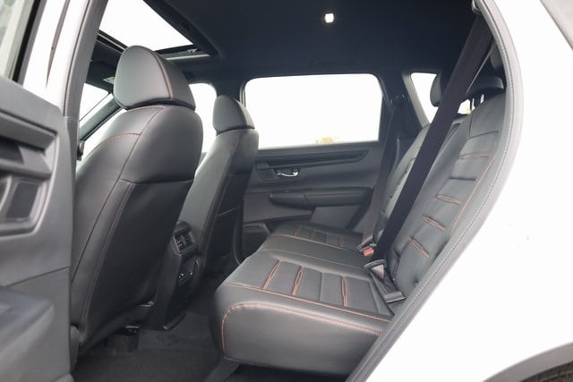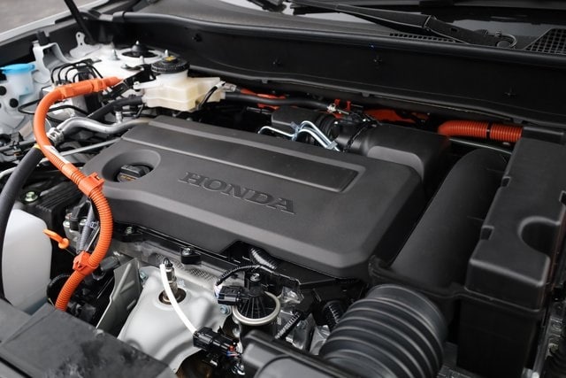 This CR-V Hybrid is well equipped with 2.0L I4 DOHC 16V, 4-Wheel Disc Brakes, 8 Speakers, ABS brakes, Adaptive Cruise Control: Adaptive Cruise Control (ACC) with Low-Speed Follow, Air Conditioning, Alloy wheels, Apple CarPlay/Android Auto, Auto High-beam Headlights, Auto-dimming Rear-View mirror, Automatic temperature control, Blind Spot Information (BSI) System warning, Brake assist, Bumpers: body-color, Compass, Delay-off headlights, Driver door bin, Driver vanity mirror, Dual front impact airbags, Dual front side impact airbags, Electronic Stability Control, Exterior Parking Camera Rear, Four wheel independent suspension, Front anti-roll bar, Front Bucket Seats, Front Center Armrest, Front dual zone A/C, Front reading lights, Fully automatic headlights, Heated door mirrors, Heated Front Bucket Seats, Heated front seats, Illuminated entry, Knee airbag, Leather Seat Trim, Leather Shift Knob, Leather steering wheel, Low tire pressure warning, Memory seat, Occupant sensing airbag, Outside temperature display, Overhead airbag, Overhead console, Panic alarm, Passenger door bin, Passenger vanity mirror, Power door mirrors, Power driver seat, Power Liftgate, Power moonroof, Power passenger seat, Power steering, Power windows, Radio data system, Radio: 320-Watt AM/FM Audio System, Rear anti-roll bar, Rear reading lights, Rear seat center armrest, Rear side impact airbag, Rear window defroster, Rear window wiper, Remote keyless entry, Security system, Speed control, Speed-sensing steering, Speed-Sensitive Wipers, Split folding rear seat, Spoiler, Steering wheel mounted audio controls, Telescoping steering wheel, Tilt steering wheel, Traction control, Trip computer, Turn signal indicator mirrors, Variably intermittent wipers, and Wheels: 18" Berlina Black.