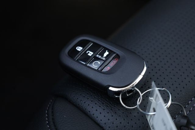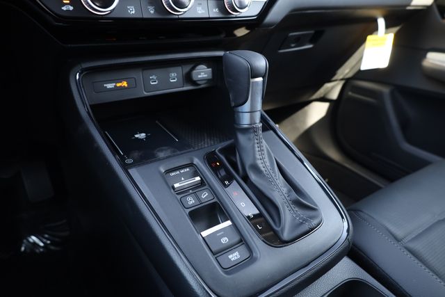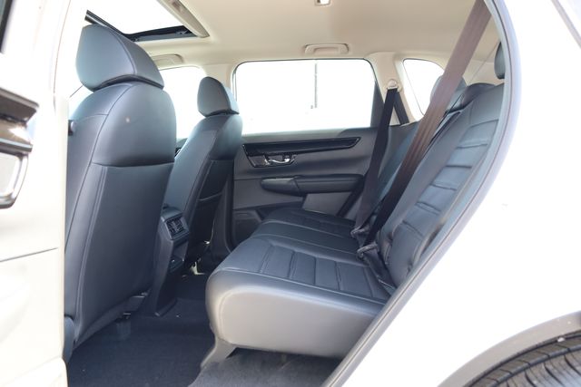 This CR-V is well equipped with 4-Wheel Disc Brakes, 8 Speakers, ABS brakes, Adaptive Cruise Control: Adaptive Cruise Control (ACC) with Low-Speed Follow, Air Conditioning, Alloy wheels, AM/FM radio, Apple CarPlay/Android Auto, Auto High-beam Headlights, Auto-dimming Rear-View mirror, Automatic temperature control, Blind Spot Information (BSI) System warning, Brake assist, Bumpers: body-color, Compass, Delay-off headlights, Driver door bin, Driver vanity mirror, Dual front impact airbags, Dual front side impact airbags, Electronic Stability Control, Exterior Parking Camera Rear, Four wheel independent suspension, Front anti-roll bar, Front Bucket Seats, Front Center Armrest, Front dual zone A/C, Front reading lights, Fully automatic headlights, Heated door mirrors, Heated Front Bucket Seats, Heated front seats, Illuminated entry, Knee airbag, Leather Seat Trim, Leather Shift Knob, Leather steering wheel, Low tire pressure warning, Memory seat, Occupant sensing airbag, Outside temperature display, Overhead airbag, Overhead console, Panic alarm, Passenger door bin, Passenger vanity mirror, Power door mirrors, Power driver seat, Power Liftgate, Power moonroof, Power passenger seat, Power steering, Power windows, Radio data system, Radio: 320-Watt AM/FM Audio System, Rear anti-roll bar, Rear reading lights, Rear seat center armrest, Rear side impact airbag, Rear window defroster, Rear window wiper, Remote keyless entry, Security system, Speed control, Speed-sensing steering, Speed-Sensitive Wipers, Split folding rear seat, Spoiler, Steering wheel mounted audio controls, Tachometer, Telescoping steering wheel, Tilt steering wheel, Traction control, Trip computer, Turn signal indicator mirrors, Variably intermittent wipers, and Wheels: 18" Shark Grey.