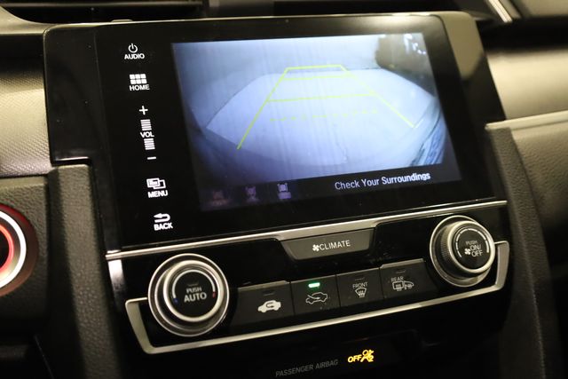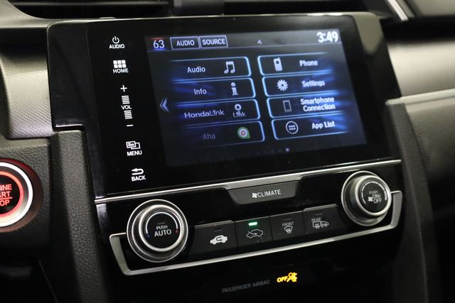 This Civic Hybrid is well equipped with 2.0L 16V DOHC, 4-Wheel Disc Brakes, 8 Speakers, ABS brakes, Adaptive Cruise Control: Adaptive Cruise Control (ACC) with Low-Speed Follow, Air Conditioning, Alloy wheels, AM/FM radio, Apple CarPlay/Android Auto, Auto High-beam Headlights, Automatic temperature control, Blind Spot Information (BSI) System warning, Brake assist, Bumpers: body-color, Cloth/Leatherette Seat Trim, Delay-off headlights, Driver door bin, Driver vanity mirror, Dual front impact airbags, Dual front side impact airbags, Electronic Stability Control, Emergency communication system: HondaLink, Exterior Parking Camera Rear, Four wheel independent suspension, Front anti-roll bar, Front Bucket Seats, Front Center Armrest, Front dual zone A/C, Front reading lights, Fully automatic headlights, Heated door mirrors, Heated Front Bucket Seats, Heated front seats, Illuminated entry, Knee airbag, Leather Shift Knob, Leather steering wheel, Low tire pressure warning, Occupant sensing airbag, Outside temperature display, Overhead airbag, Panic alarm, Passenger door bin, Passenger vanity mirror, Power door mirrors, Power moonroof, Power steering, Power windows, Radio data system, Radio: 180-Watt Audio System, Rear anti-roll bar, Rear seat center armrest, Rear side impact airbag, Rear window defroster, Remote keyless entry, Security system, Speed control, Speed-sensing steering, Split folding rear seat, Steering wheel mounted audio controls, Tachometer, Telescoping steering wheel, Tilt steering wheel, Traction control, Trip computer, Variably intermittent wipers, and Wheels: 18" Gloss Black Alloy.