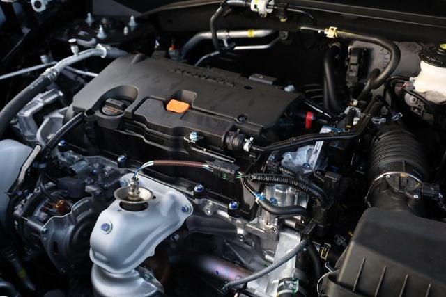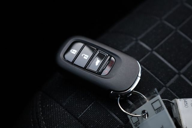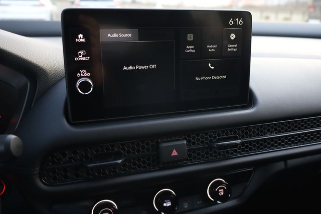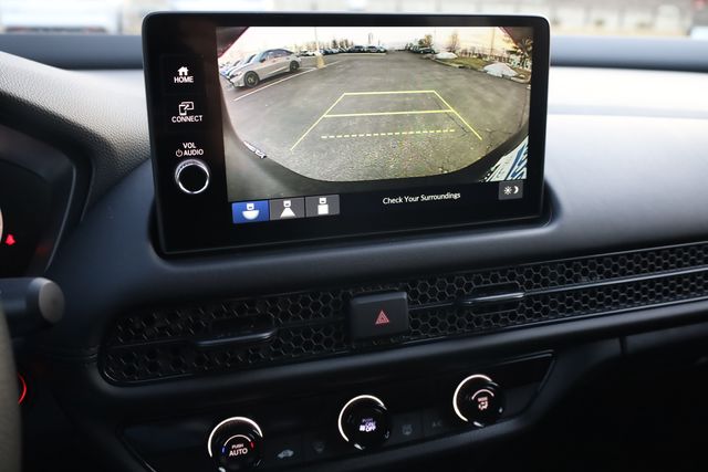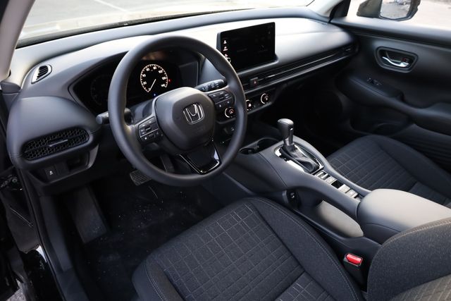 This HR-V is well equipped with 4 Speakers, 4-Wheel Disc Brakes, ABS brakes, Adaptive Cruise Control: Adaptive Cruise Control (ACC) with Low-Speed Follow, Air Conditioning, Alloy wheels, AM/FM radio, Apple CarPlay/Android Auto, Auto High-beam Headlights, Automatic temperature control, Brake assist, Bumpers: body-color, Cloth Seat Trim, Compass, Delay-off headlights, Driver door bin, Driver vanity mirror, Dual front impact airbags, Dual front side impact airbags, Electronic Stability Control, Exterior Parking Camera Rear, Four wheel independent suspension, Front anti-roll bar, Front Bucket Seats, Front Center Armrest, Front reading lights, Fully automatic headlights, Illuminated entry, Knee airbag, Low tire pressure warning, Occupant sensing airbag, Outside temperature display, Overhead airbag, Panic alarm, Passenger door bin, Passenger vanity mirror, Power door mirrors, Power steering, Power windows, Radio data system, Radio: 180-Watt Audio System with 4 Speakers, Rear anti-roll bar, Rear reading lights, Rear side impact airbag, Rear window defroster, Rear window wiper, Remote keyless entry, Security system, Speed control, Speed-sensing steering, Split folding rear seat, Spoiler, Steering wheel mounted audio controls, Tachometer, Telescoping steering wheel, Tilt steering wheel, Traction control, Trip computer, Variably intermittent wipers, and Wheels: 17" Pewter Gray Alloy.