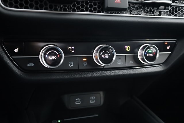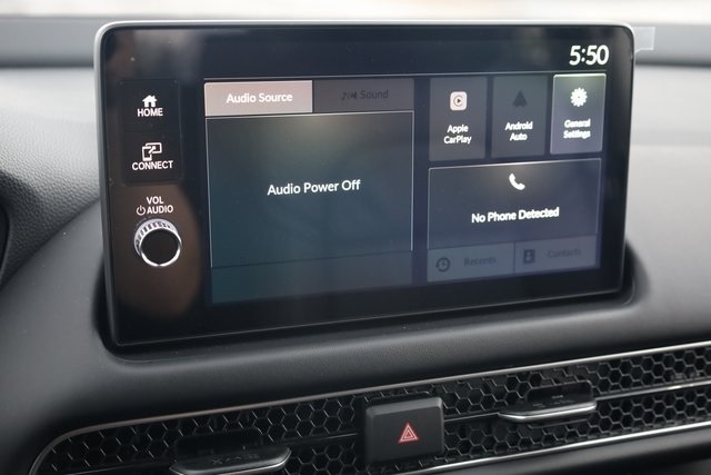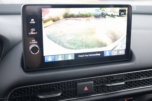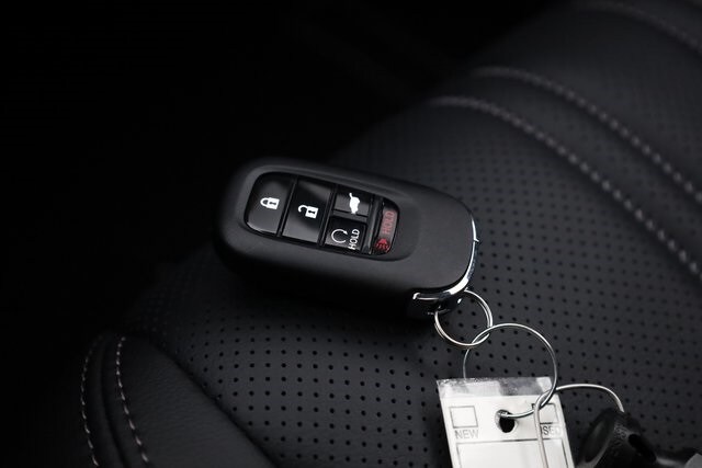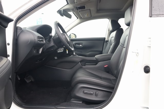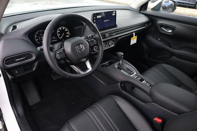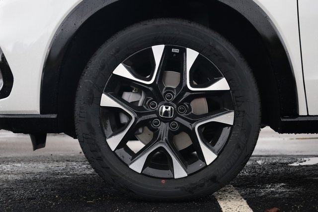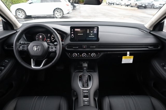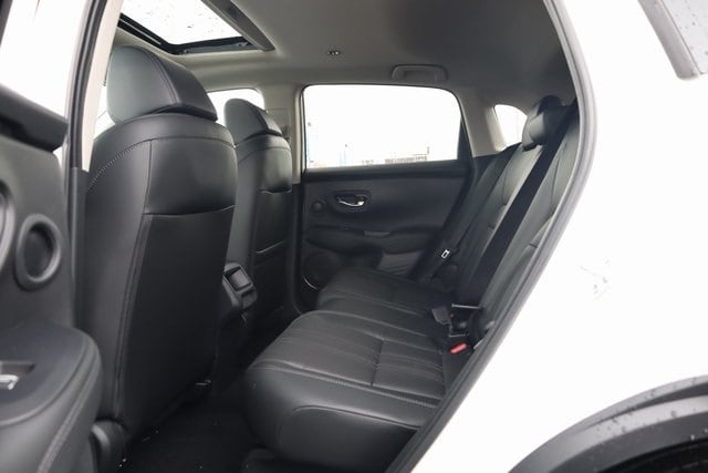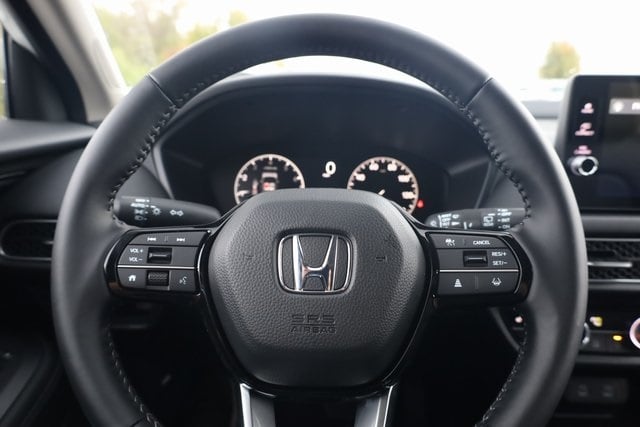 This HR-V is well equipped with 18" Machine-Finished Alloy Wheels, 4-Wheel Disc Brakes, 8 Speakers, ABS brakes, Adaptive Cruise Control: Adaptive Cruise Control (ACC) with Low-Speed Follow, Air Conditioning, Alloy wheels, AM/FM radio, Apple CarPlay/Android Auto, Auto High-beam Headlights, Auto-dimming Rear-View mirror, Automatic temperature control, Blind Spot Information (BSI) System warning, Brake assist, Bumpers: body-color, Compass, Delay-off headlights, Driver door bin, Driver vanity mirror, Dual front impact airbags, Dual front side impact airbags, Electronic Stability Control, Exterior Parking Camera Rear, Four wheel independent suspension, Front anti-roll bar, Front Bucket Seats, Front Center Armrest, Front dual zone A/C, Front reading lights, Fully automatic headlights, Heated door mirrors, Heated Front Bucket Seats, Heated front seats, Illuminated entry, Knee airbag, Leather Shift Knob, Leather steering wheel, Leather-Trimmed Seats, Low tire pressure warning, Occupant sensing airbag, Outside temperature display, Overhead airbag, Panic alarm, Passenger door bin, Passenger vanity mirror, Power door mirrors, Power driver seat, Power moonroof, Power steering, Power windows, Radio data system, Radio: 180-Watt Audio System w/8 Speakers, Rear anti-roll bar, Rear reading lights, Rear side impact airbag, Rear window defroster, Rear window wiper, Remote keyless entry, Security system, Speed control, Speed-sensing steering, Split folding rear seat, Spoiler, Steering wheel mounted audio controls, Tachometer, Telescoping steering wheel, Tilt steering wheel, Traction control, Trip computer, Turn signal indicator mirrors, and Variably intermittent wipers.