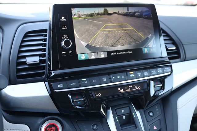 This Odyssey is well equipped with 18" Machine-Finished Alloy Wheels, 3rd row seats: split-bench, 4-Wheel Disc Brakes, 7 Speakers, ABS brakes, Adaptive Cruise Control: Adaptive Cruise Control (ACC) with Low-Speed Follow, Air Conditioning, Alloy wheels, AM/FM radio: SiriusXM, Anti-whiplash front head restraints, Apple CarPlay/Android Auto, Auto High-beam Headlights, Auto-dimming Rear-View mirror, Automatic temperature control, Blind Spot Information (BSI) System warning, Brake assist, Bumpers: body-color, Delay-off headlights, Driver door bin, Driver vanity mirror, Driver's Seat Mounted Armrest, Dual front impact airbags, Dual front side impact airbags, Electronic Stability Control, Exterior Parking Camera Rear, Four wheel independent suspension, Front anti-roll bar, Front Bucket Seats, Front dual zone A/C, Front fog lights, Front reading lights, Fully automatic headlights, Garage door transmitter: HomeLink, Heated door mirrors, Heated Front Bucket Seats, Heated front seats, Illuminated entry, Knee airbag, Lane departure: Lane Keeping Assist System (LKAS) active, Leather steering wheel, Leather-Trimmed Seats, Low tire pressure warning, Memory seat, Occupant sensing airbag, Outside temperature display, Overhead airbag, Overhead console, Panic alarm, Passenger door bin, Passenger seat mounted armrest, Passenger vanity mirror, Power door mirrors, Power driver seat, Power Liftgate, Power moonroof, Power passenger seat, Power steering, Power windows, Radio data system, Radio: 160-Watt AM/FM/HD/SiriusXM Audio System, Rear air conditioning, Rear anti-roll bar, Rear reading lights, Rear seat center armrest, Rear window defroster, Rear window wiper, Reclining 3rd row seat, Remote keyless entry, Security system, Speed control, Speed-sensing steering, Speed-Sensitive Wipers, Split folding rear seat, Spoiler, Steering wheel mounted audio controls, Tachometer, Telescoping steering wheel, Tilt steering wheel, Traction control, Trip computer, Turn signal indicator mirrors, and Variably intermittent wipers.