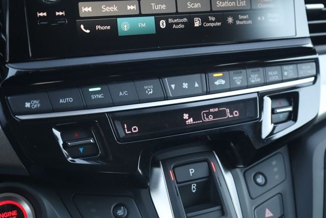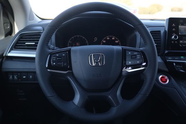 This Odyssey is well equipped with 18" Machine-Finished Alloy Wheels, 3rd row seats: split-bench, 4-Wheel Disc Brakes, 7 Speakers, ABS brakes, Adaptive Cruise Control: Adaptive Cruise Control (ACC) with Low-Speed Follow, Air Conditioning, Alloy wheels, AM/FM radio: SiriusXM, Anti-whiplash front head restraints, Apple CarPlay/Android Auto, Auto High-beam Headlights, Auto-dimming Rear-View mirror, Automatic temperature control, Blind Spot Information (BSI) System warning, Brake assist, Bumpers: body-color, Delay-off headlights, Driver door bin, Driver vanity mirror, Driver's Seat Mounted Armrest, Dual front impact airbags, Dual front side impact airbags, Electronic Stability Control, Exterior Parking Camera Rear, Four wheel independent suspension, Front anti-roll bar, Front Bucket Seats, Front dual zone A/C, Front fog lights, Front reading lights, Fully automatic headlights, Garage door transmitter: HomeLink, Heated door mirrors, Heated Front Bucket Seats, Heated front seats, Illuminated entry, Knee airbag, Lane departure: Lane Keeping Assist System (LKAS) active, Leather steering wheel, Leather-Trimmed Seats, Low tire pressure warning, Memory seat, Occupant sensing airbag, Outside temperature display, Overhead airbag, Overhead console, Panic alarm, Passenger door bin, Passenger seat mounted armrest, Passenger vanity mirror, Power door mirrors, Power driver seat, Power Liftgate, Power moonroof, Power passenger seat, Power steering, Power windows, Radio data system, Radio: 160-Watt AM/FM/HD/SiriusXM Audio System, Rear air conditioning, Rear anti-roll bar, Rear reading lights, Rear seat center armrest, Rear window defroster, Rear window wiper, Reclining 3rd row seat, Remote keyless entry, Security system, Speed control, Speed-sensing steering, Speed-Sensitive Wipers, Split folding rear seat, Spoiler, Steering wheel mounted audio controls, Tachometer, Telescoping steering wheel, Tilt steering wheel, Traction control, Trip computer, Turn signal indicator mirrors, and Variably intermittent wipers.