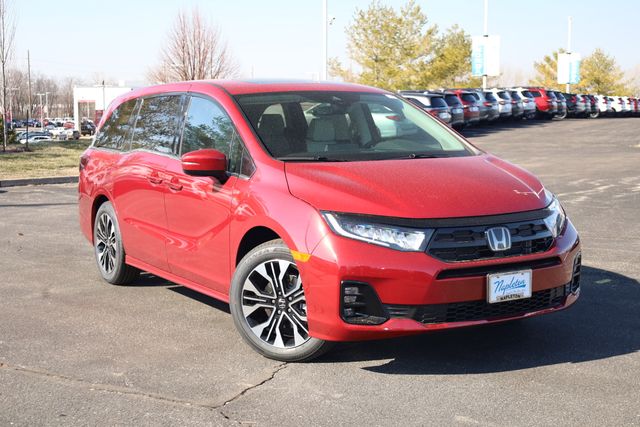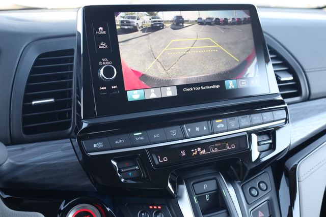 This Odyssey is well equipped with 11 Speakers, 3rd row seats: split-bench, 4-Wheel Disc Brakes, ABS brakes, Adaptive Cruise Control: Adaptive Cruise Control (ACC) with Low-Speed Follow, Air Conditioning, Alloy wheels, AM/FM radio: SiriusXM, Anti-whiplash front head restraints, Apple CarPlay/Android Auto, Auto High-beam Headlights, Auto-dimming door mirrors, Auto-dimming Rear-View mirror, Automatic temperature control, Blind Spot Information (BSI) System warning, Brake assist, Bumpers: body-color, Compass, Delay-off headlights, Driver door bin, Driver vanity mirror, Driver's Seat Mounted Armrest, Dual front impact airbags, Dual front side impact airbags, Electronic Stability Control, Emergency communication system: HondaLink, Exterior Parking Camera Rear, Four wheel independent suspension, Front anti-roll bar, Front Bucket Seats, Front dual zone A/C, Front fog lights, Front reading lights, Fully automatic headlights, Garage door transmitter: HomeLink, Heated and Ventilated Front Bucket Seats, Heated door mirrors, Heated front seats, Heated steering wheel, Illuminated entry, Knee airbag, Lane departure: Lane Keeping Assist System (LKAS) active, Leather steering wheel, Low tire pressure warning, Memory seat, Navigation system: Honda Satellite-Linked Navigation System, Occupant sensing airbag, Outside temperature display, Overhead airbag, Overhead console, Panic alarm, Passenger door bin, Passenger seat mounted armrest, Passenger vanity mirror, Perforated Leather-Trimmed Seats with Piping, Power door mirrors, Power driver seat, Power Liftgate, Power moonroof, Power passenger seat, Power steering, Power windows, Radio data system, Radio: 500-Watt AM/FM/HD Premium Audio System, Rain sensing wipers, Rear air conditioning, Rear anti-roll bar, Rear audio controls, Rear reading lights, Rear seat center armrest, Rear window defroster, Rear window wiper, Reclining 3rd row seat, Remote keyless entry, Security system, Speed control, Speed-sensing steering, Speed-Sensitive Wipers, Split folding rear seat, Spoiler, Steering wheel mounted audio controls, Tachometer, Telescoping steering wheel, Tilt steering wheel, Traction control, Trip computer, Turn signal indicator mirrors, Variably intermittent wipers, Ventilated front seats, and Wheels: 19" Machine-Finished Alloy.