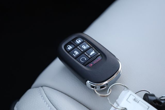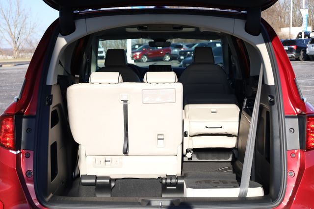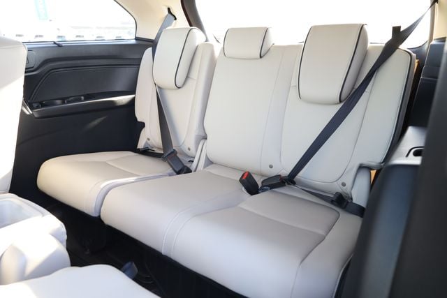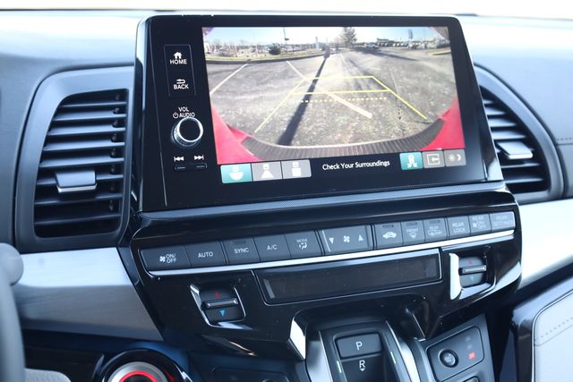 This Odyssey is well equipped with 3rd row seats: split-bench, 4-Wheel Disc Brakes, 7 Speakers, ABS brakes, Adaptive Cruise Control: Adaptive Cruise Control (ACC) with Low-Speed Follow, Air Conditioning, Alloy wheels, AM/FM radio: SiriusXM, Anti-whiplash front head restraints, Apple CarPlay/Android Auto, Auto High-beam Headlights, Auto-dimming Rear-View mirror, Automatic temperature control, Blind Spot Information (BSI) System warning, Brake assist, Bumpers: body-color, Compass, Delay-off headlights, Driver door bin, Driver vanity mirror, Driver's Seat Mounted Armrest, Dual front impact airbags, Dual front side impact airbags, Electronic Stability Control, Emergency communication system: HondaLink, Exterior Parking Camera Rear, Four wheel independent suspension, Front anti-roll bar, Front Bucket Seats, Front dual zone A/C, Front fog lights, Front reading lights, Fully automatic headlights, Garage door transmitter: HomeLink, Heated door mirrors, Heated Front Bucket Seats, Heated front seats, Illuminated entry, Knee airbag, Lane departure: Lane Keeping Assist System (LKAS) active, Leather steering wheel, Leather-Trimmed Seats with Piping, Low tire pressure warning, Memory seat, Navigation system: Honda Satellite-Linked Navigation System, Occupant sensing airbag, Outside temperature display, Overhead airbag, Overhead console, Panic alarm, Passenger door bin, Passenger seat mounted armrest, Passenger vanity mirror, Power door mirrors, Power driver seat, Power Liftgate, Power moonroof, Power passenger seat, Power steering, Power windows, Radio data system, Radio: 160-Watt AM/FM/HD/SiriusXM Audio System, Rear air conditioning, Rear anti-roll bar, Rear audio controls, Rear reading lights, Rear seat center armrest, Rear window defroster, Rear window wiper, Reclining 3rd row seat, Remote keyless entry, Security system, Speed control, Speed-sensing steering, Speed-Sensitive Wipers, Split folding rear seat, Spoiler, Steering wheel mounted audio controls, Tachometer, Telescoping steering wheel, Tilt steering wheel, Traction control, Trip computer, Turn signal indicator mirrors, Variably intermittent wipers, and Wheels: 19" Gray Alloy.