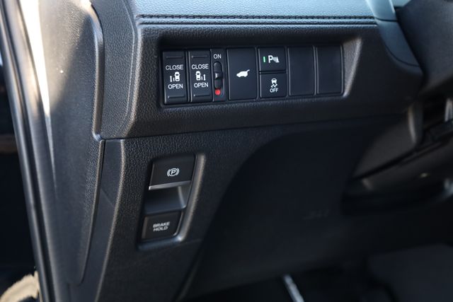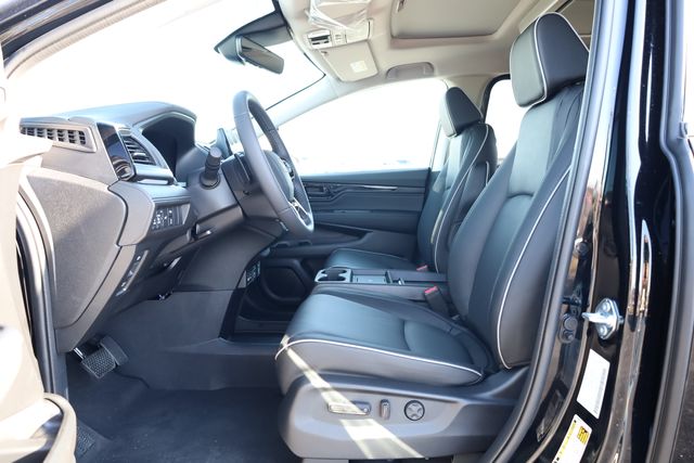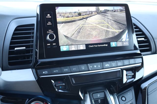 This Odyssey is well equipped with Utility Package (Crossbars and Roof Rails), 3rd row seats: split-bench, 4-Wheel Disc Brakes, 7 Speakers, ABS brakes, Adaptive Cruise Control: Adaptive Cruise Control (ACC) with Low-Speed Follow, Air Conditioning, Alloy wheels, AM/FM radio: SiriusXM, Anti-whiplash front head restraints, Apple CarPlay/Android Auto, Auto High-beam Headlights, Auto-dimming Rear-View mirror, Automatic temperature control, Blind Spot Information (BSI) System warning, Brake assist, Bumpers: body-color, Compass, Delay-off headlights, Driver door bin, Driver vanity mirror, Driver's Seat Mounted Armrest, Dual front impact airbags, Dual front side impact airbags, Electronic Stability Control, Emergency communication system: HondaLink, Exterior Parking Camera Rear, Four wheel independent suspension, Front anti-roll bar, Front Bucket Seats, Front dual zone A/C, Front fog lights, Front reading lights, Fully automatic headlights, Garage door transmitter: HomeLink, Heated door mirrors, Heated Front Bucket Seats, Heated front seats, Illuminated entry, Knee airbag, Lane departure: Lane Keeping Assist System (LKAS) active, Leather steering wheel, Leather-Trimmed Seats with Piping, Low tire pressure warning, Memory seat, Navigation system: Honda Satellite-Linked Navigation System, Occupant sensing airbag, Outside temperature display, Overhead airbag, Overhead console, Panic alarm, Passenger door bin, Passenger seat mounted armrest, Passenger vanity mirror, Power door mirrors, Power driver seat, Power Liftgate, Power moonroof, Power passenger seat, Power steering, Power windows, Radio data system, Radio: 160-Watt AM/FM/HD/SiriusXM Audio System, Rear air conditioning, Rear anti-roll bar, Rear audio controls, Rear reading lights, Rear seat center armrest, Rear window defroster, Rear window wiper, Reclining 3rd row seat, Remote keyless entry, Security system, Speed control, Speed-sensing steering, Speed-Sensitive Wipers, Split folding rear seat, Spoiler, Steering wheel mounted audio controls, Tachometer, Telescoping steering wheel, Tilt steering wheel, Traction control, Trip computer, Turn signal indicator mirrors, Variably intermittent wipers, and Wheels: 19" Gray Alloy.