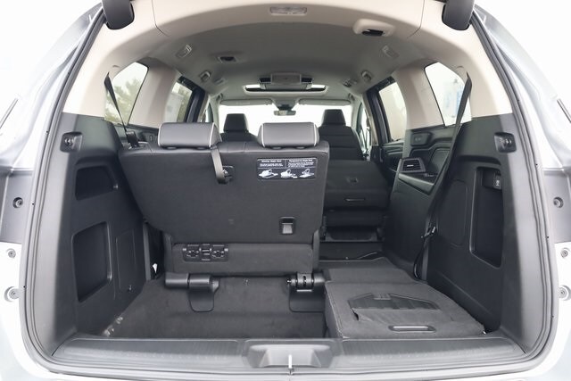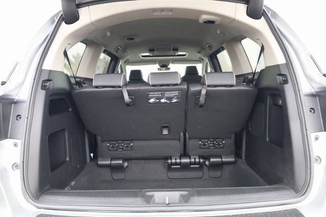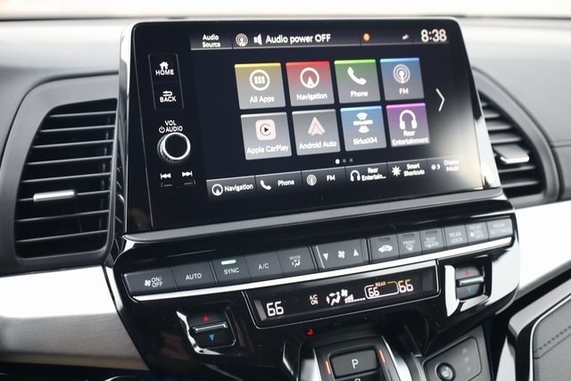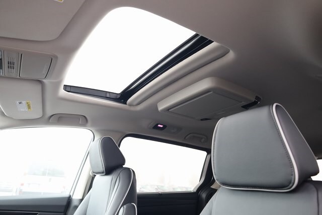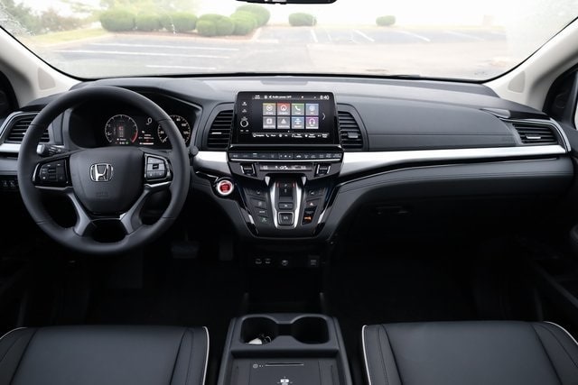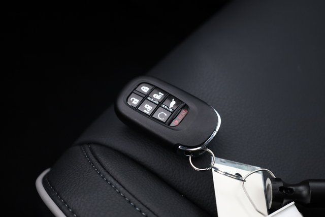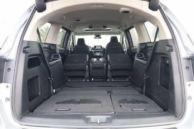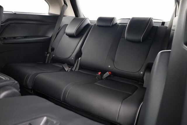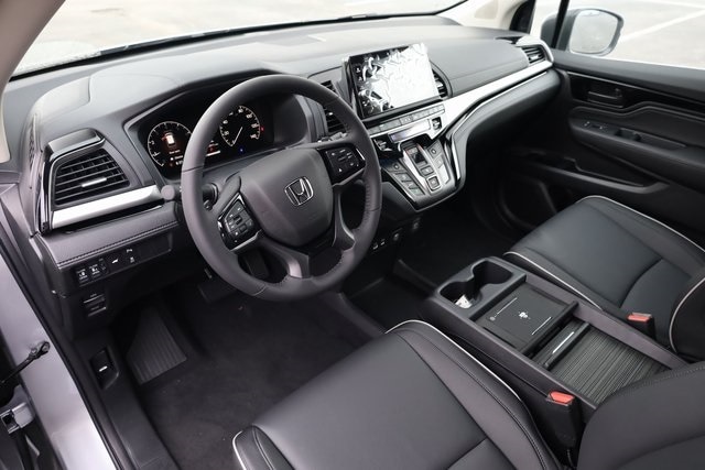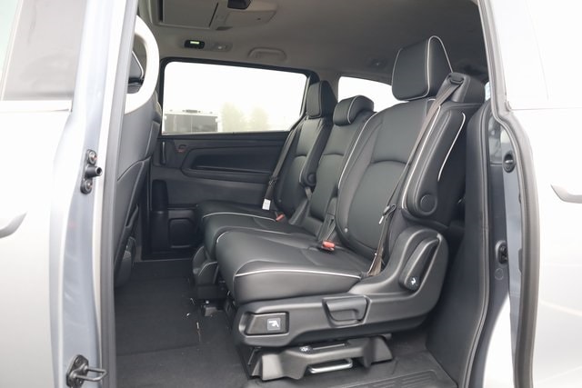 This Odyssey is well equipped with 3rd row seats: split-bench, 4-Wheel Disc Brakes, 7 Speakers, ABS brakes, Adaptive Cruise Control: Adaptive Cruise Control (ACC) with Low-Speed Follow, Air Conditioning, Alloy wheels, AM/FM radio: SiriusXM, Anti-whiplash front head restraints, Apple CarPlay/Android Auto, Auto High-beam Headlights, Auto-dimming Rear-View mirror, Automatic temperature control, Blind Spot Information (BSI) System warning, Brake assist, Bumpers: body-color, Compass, Delay-off headlights, Driver door bin, Driver vanity mirror, Driver's Seat Mounted Armrest, Dual front impact airbags, Dual front side impact airbags, Electronic Stability Control, Emergency communication system: HondaLink, Exterior Parking Camera Rear, Four wheel independent suspension, Front anti-roll bar, Front Bucket Seats, Front dual zone A/C, Front fog lights, Front reading lights, Fully automatic headlights, Garage door transmitter: HomeLink, Heated door mirrors, Heated Front Bucket Seats, Heated front seats, Illuminated entry, Knee airbag, Lane departure: Lane Keeping Assist System (LKAS) active, Leather steering wheel, Leather-Trimmed Seats w/Piping, Low tire pressure warning, Memory seat, Navigation system: Honda Satellite-Linked Navigation System, Occupant sensing airbag, Outside temperature display, Overhead airbag, Overhead console, Panic alarm, Passenger door bin, Passenger seat mounted armrest, Passenger vanity mirror, Power door mirrors, Power driver seat, Power Liftgate, Power moonroof, Power passenger seat, Power steering, Power windows, Radio data system, Radio: 160-Watt AM/FM/HD/SiriusXM Audio System, Rear air conditioning, Rear anti-roll bar, Rear audio controls, Rear reading lights, Rear seat center armrest, Rear window defroster, Rear window wiper, Reclining 3rd row seat, Remote keyless entry, Security system, Speed control, Speed-sensing steering, Speed-Sensitive Wipers, Split folding rear seat, Spoiler, Steering wheel mounted audio controls, Tachometer, Telescoping steering wheel, Tilt steering wheel, Traction control, Trip computer, Turn signal indicator mirrors, Variably intermittent wipers, and Wheels: 19" Gray Alloy.