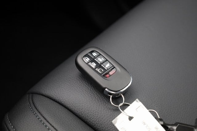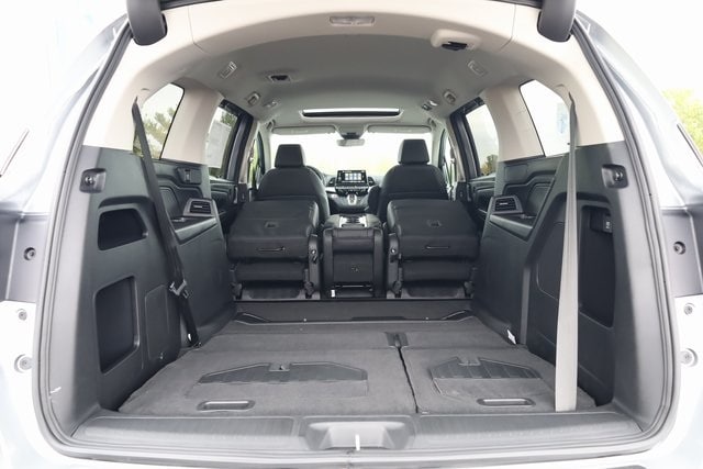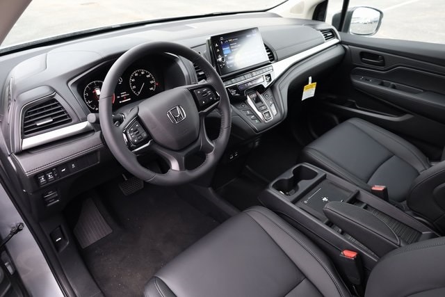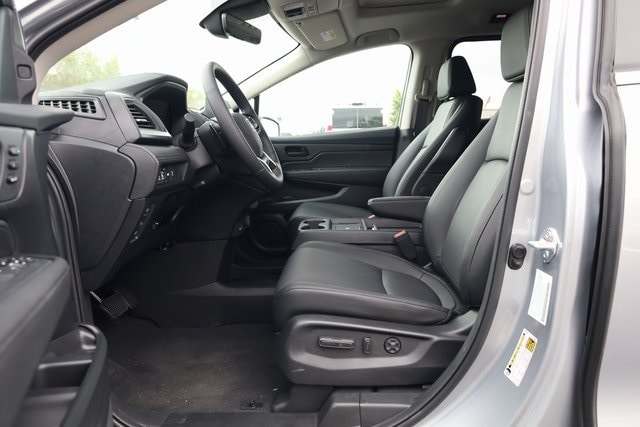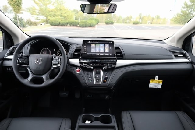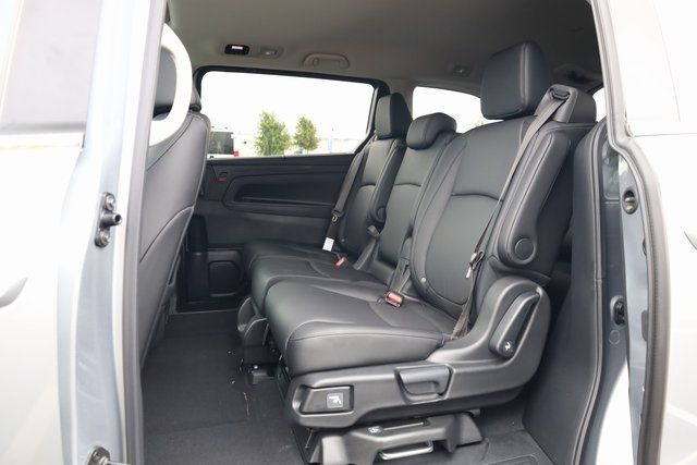 This Odyssey is well equipped with 18" Machine-Finished Alloy Wheels, 3rd row seats: split-bench, 4-Wheel Disc Brakes, 7 Speakers, ABS brakes, Adaptive Cruise Control: Adaptive Cruise Control (ACC) with Low-Speed Follow, Air Conditioning, Alloy wheels, AM/FM radio: SiriusXM, Anti-whiplash front head restraints, Apple CarPlay/Android Auto, Auto High-beam Headlights, Auto-dimming Rear-View mirror, Automatic temperature control, Blind Spot Information (BSI) System warning, Brake assist, Bumpers: body-color, Delay-off headlights, Driver door bin, Driver vanity mirror, Driver's Seat Mounted Armrest, Dual front impact airbags, Dual front side impact airbags, Electronic Stability Control, Exterior Parking Camera Rear, Four wheel independent suspension, Front anti-roll bar, Front Bucket Seats, Front dual zone A/C, Front fog lights, Front reading lights, Fully automatic headlights, Garage door transmitter: HomeLink, Heated door mirrors, Heated Front Bucket Seats, Heated front seats, Illuminated entry, Knee airbag, Lane departure: Lane Keeping Assist System (LKAS) active, Leather steering wheel, Leather-Trimmed Seats, Low tire pressure warning, Memory seat, Occupant sensing airbag, Outside temperature display, Overhead airbag, Overhead console, Panic alarm, Passenger door bin, Passenger seat mounted armrest, Passenger vanity mirror, Power door mirrors, Power driver seat, Power Liftgate, Power moonroof, Power passenger seat, Power steering, Power windows, Radio data system, Radio: 160-Watt AM/FM/HD/SiriusXM Audio System, Rear air conditioning, Rear anti-roll bar, Rear reading lights, Rear seat center armrest, Rear window defroster, Rear window wiper, Reclining 3rd row seat, Remote keyless entry, Security system, Speed control, Speed-sensing steering, Speed-Sensitive Wipers, Split folding rear seat, Spoiler, Steering wheel mounted audio controls, Tachometer, Telescoping steering wheel, Tilt steering wheel, Traction control, Trip computer, Turn signal indicator mirrors, and Variably intermittent wipers.