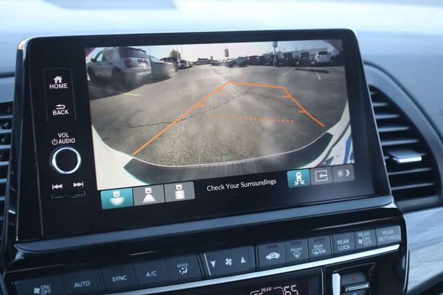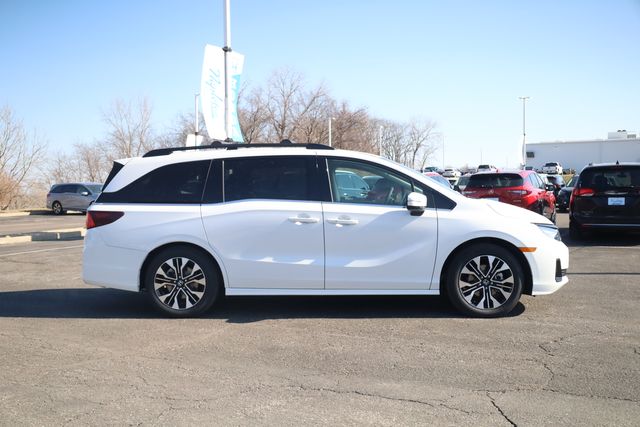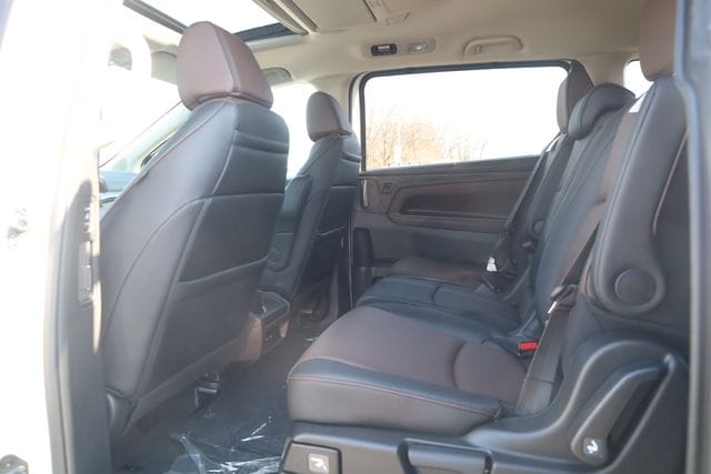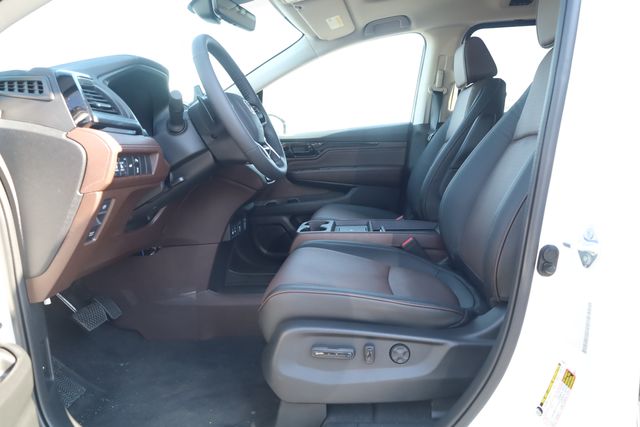 This Odyssey is well equipped with 11 Speakers, 3rd row seats: split-bench, 4-Wheel Disc Brakes, ABS brakes, Adaptive Cruise Control: Adaptive Cruise Control (ACC) with Low-Speed Follow, Air Conditioning, Alloy wheels, AM/FM radio: SiriusXM, Anti-whiplash front head restraints, Apple CarPlay/Android Auto, Auto High-beam Headlights, Auto-dimming door mirrors, Auto-dimming Rear-View mirror, Automatic temperature control, Blind Spot Information (BSI) System warning, Brake assist, Bumpers: body-color, Compass, Delay-off headlights, Driver door bin, Driver vanity mirror, Driver's Seat Mounted Armrest, Dual front impact airbags, Dual front side impact airbags, Electronic Stability Control, Emergency communication system: HondaLink, Exterior Parking Camera Rear, Four wheel independent suspension, Front anti-roll bar, Front Bucket Seats, Front dual zone A/C, Front fog lights, Front reading lights, Fully automatic headlights, Garage door transmitter: HomeLink, Heated and Ventilated Front Bucket Seats, Heated door mirrors, Heated front seats, Heated steering wheel, Illuminated entry, Knee airbag, Lane departure: Lane Keeping Assist System (LKAS) active, Leather steering wheel, Low tire pressure warning, Memory seat, Navigation system: Honda Satellite-Linked Navigation System, Occupant sensing airbag, Outside temperature display, Overhead airbag, Overhead console, Panic alarm, Passenger door bin, Passenger seat mounted armrest, Passenger vanity mirror, Perforated Leather-Trimmed Seats with Piping, Power door mirrors, Power driver seat, Power Liftgate, Power moonroof, Power passenger seat, Power steering, Power windows, Radio data system, Radio: 500-Watt AM/FM/HD Premium Audio System, Rain sensing wipers, Rear air conditioning, Rear anti-roll bar, Rear audio controls, Rear reading lights, Rear seat center armrest, Rear window defroster, Rear window wiper, Reclining 3rd row seat, Remote keyless entry, Security system, Speed control, Speed-sensing steering, Speed-Sensitive Wipers, Split folding rear seat, Spoiler, Steering wheel mounted audio controls, Tachometer, Telescoping steering wheel, Tilt steering wheel, Traction control, Trip computer, Turn signal indicator mirrors, Variably intermittent wipers, Ventilated front seats, and Wheels: 19" Machine-Finished Alloy.