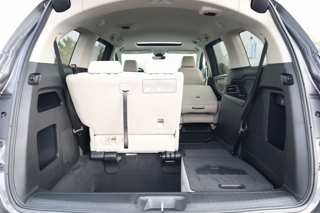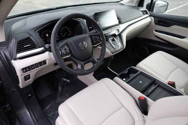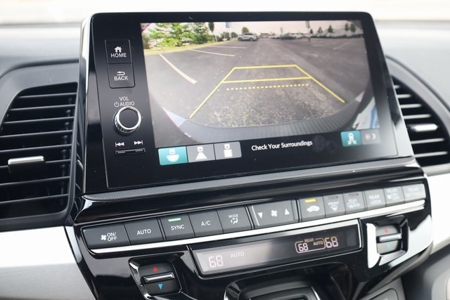 This Odyssey is well equipped with 18" Machine-Finished Alloy Wheels, 3rd row seats: split-bench, 4-Wheel Disc Brakes, 7 Speakers, ABS brakes, Adaptive Cruise Control: Adaptive Cruise Control (ACC) with Low-Speed Follow, Air Conditioning, Alloy wheels, AM/FM radio: SiriusXM, Anti-whiplash front head restraints, Apple CarPlay/Android Auto, Auto High-beam Headlights, Auto-dimming Rear-View mirror, Automatic temperature control, Blind Spot Information (BSI) System warning, Brake assist, Bumpers: body-color, Delay-off headlights, Driver door bin, Driver vanity mirror, Driver's Seat Mounted Armrest, Dual front impact airbags, Dual front side impact airbags, Electronic Stability Control, Exterior Parking Camera Rear, Four wheel independent suspension, Front anti-roll bar, Front Bucket Seats, Front dual zone A/C, Front fog lights, Front reading lights, Fully automatic headlights, Garage door transmitter: HomeLink, Heated door mirrors, Heated Front Bucket Seats, Heated front seats, Illuminated entry, Knee airbag, Lane departure: Lane Keeping Assist System (LKAS) active, Leather steering wheel, Leather-Trimmed Seats, Low tire pressure warning, Memory seat, Occupant sensing airbag, Outside temperature display, Overhead airbag, Overhead console, Panic alarm, Passenger door bin, Passenger seat mounted armrest, Passenger vanity mirror, Power door mirrors, Power driver seat, Power Liftgate, Power moonroof, Power passenger seat, Power steering, Power windows, Radio data system, Radio: 160-Watt AM/FM/HD/SiriusXM Audio System, Rear air conditioning, Rear anti-roll bar, Rear reading lights, Rear seat center armrest, Rear window defroster, Rear window wiper, Reclining 3rd row seat, Remote keyless entry, Security system, Speed control, Speed-sensing steering, Speed-Sensitive Wipers, Split folding rear seat, Spoiler, Steering wheel mounted audio controls, Tachometer, Telescoping steering wheel, Tilt steering wheel, Traction control, Trip computer, Turn signal indicator mirrors, and Variably intermittent wipers.