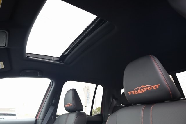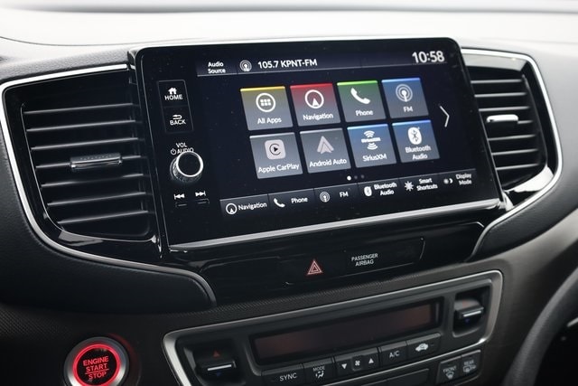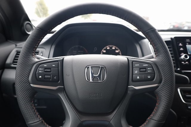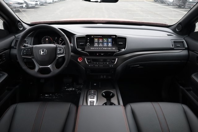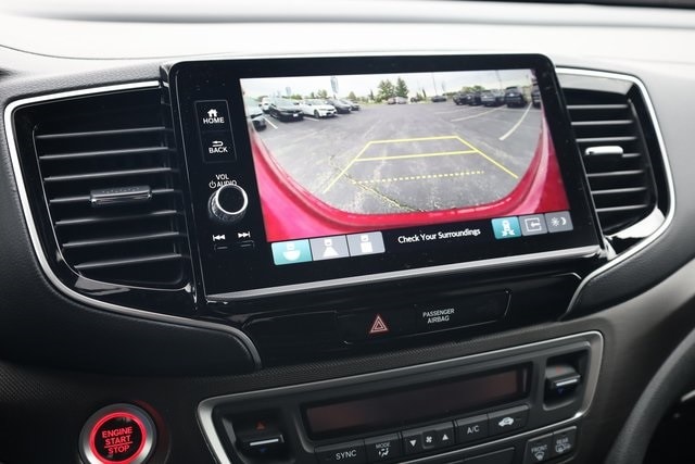 This Ridgeline is well equipped with Black Leather, 4-Wheel Disc Brakes, 4.33 Axle Ratio, 7 Speakers, ABS brakes, Air Conditioning, Alloy wheels, AM/FM radio: SiriusXM, Auto-dimming Rear-View mirror, Automatic temperature control, Blind Spot Information (BSI) System warning, Bluetooth® Hands-Free Link, Brake assist, Bumpers: body-color, Compass, Delay-off headlights, Driver door bin, Driver vanity mirror, Driver's Seat Mounted Armrest, Dual front impact airbags, Dual front side impact airbags, Electronic Stability Control, Emergency communication system: HondaLink Assist, Exterior Parking Camera Rear, Four wheel independent suspension, Front anti-roll bar, Front Bucket Seats, Front dual zone A/C, Front fog lights, Front reading lights, Fully automatic headlights, Garage door transmitter: HomeLink, Heated door mirrors, Heated Front Bucket Seats, Heated front seats, Heated steering wheel, Honda Satellite-Linked Navigation System, Illuminated entry, Leather Seat Trim, Leather steering wheel, Low tire pressure warning, Memory seat, Navigation system: Honda Satellite-Linked Navigation System, Occupant sensing airbag, Outside temperature display, Overhead airbag, Overhead console, Panic alarm, Passenger door bin, Passenger seat mounted armrest, Passenger vanity mirror, Power door mirrors, Power driver seat, Power moonroof, Power passenger seat, Power steering, Power windows, Radio data system, Radio: 215-Watt Audio System with 7 Speakers, Rear air conditioning, Rear anti-roll bar, Rear reading lights, Rear seat center armrest, Rear step bumper, Rear window defroster, Remote keyless entry, Security system, SiriusXM, Speed control, Speed-sensing steering, Split folding rear seat, Steering wheel mounted audio controls, Tachometer, Telescoping steering wheel, Tilt steering wheel, Traction control, Trip computer, Turn signal indicator mirrors, Variably intermittent wipers, and Wheels: 18" Trailsport Shark Gray Alloy.