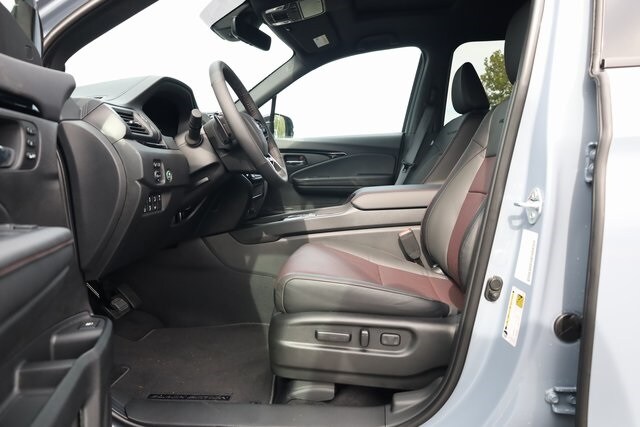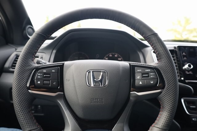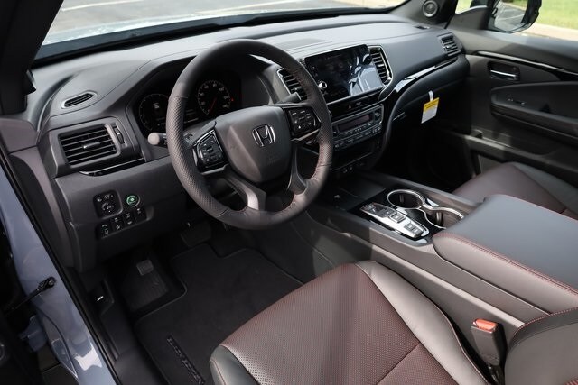 This Ridgeline is well equipped with Black Leather, 4-Wheel Disc Brakes, 4.33 Axle Ratio, 8 Speakers, ABS brakes, Air Conditioning, Alloy wheels, AM/FM radio: SiriusXM, Auto High-beam Headlights, Auto-dimming Rear-View mirror, Automatic temperature control, Blind Spot Information (BSI) System warning, Bluetooth® Hands-Free Link, Brake assist, Bumpers: body-color, Compass, Delay-off headlights, Driver door bin, Driver vanity mirror, Driver's Seat Mounted Armrest, Dual front impact airbags, Dual front side impact airbags, Electronic Stability Control, Emergency communication system: HondaLink Assist, Exterior Parking Camera Rear, Four wheel independent suspension, Front anti-roll bar, Front Bucket Seats, Front dual zone A/C, Front fog lights, Front reading lights, Fully automatic headlights, Garage door transmitter: HomeLink, Heated & Ventilated Front Bucket Seats, Heated door mirrors, Heated front seats, Heated rear seats, Heated steering wheel, Honda Satellite-Linked Navigation System, Illuminated entry, Leather Seat Trim, Leather steering wheel, Low tire pressure warning, Memory seat, Navigation system: Honda Satellite-Linked Navigation System, Occupant sensing airbag, Outside temperature display, Overhead airbag, Overhead console, Panic alarm, Passenger door bin, Passenger seat mounted armrest, Passenger vanity mirror, Power door mirrors, Power driver seat, Power moonroof, Power passenger seat, Power steering, Power windows, Radio data system, Radio: 540-Watt Premium Audio System w/8 Speakers, Rear air conditioning, Rear anti-roll bar, Rear reading lights, Rear seat center armrest, Rear step bumper, Rear window defroster, Remote keyless entry, Security system, SiriusXM, Speed control, Speed-sensing steering, Split folding rear seat, Steering wheel mounted audio controls, Tachometer, Telescoping steering wheel, Tilt steering wheel, Traction control, Trip computer, Turn signal indicator mirrors, Variably intermittent wipers, Ventilated front seats, and Wheels: 18" Berlina Black Alloy.