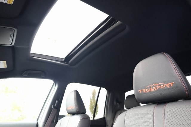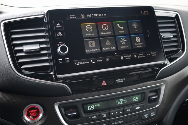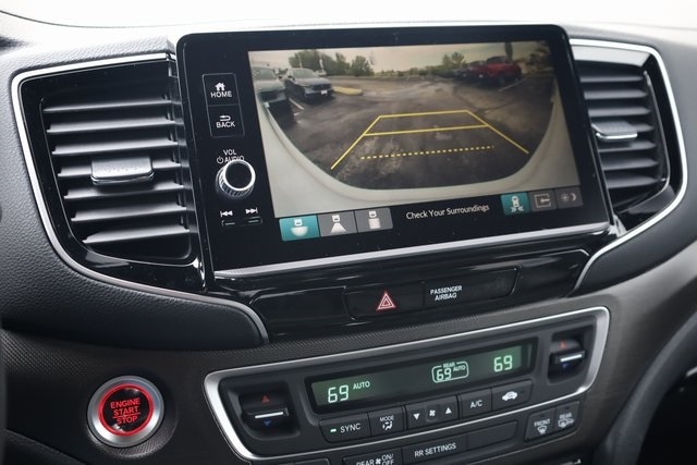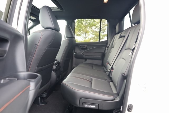 This Ridgeline is well equipped with Black Leather, 4-Wheel Disc Brakes, 4.33 Axle Ratio, 7 Speakers, ABS brakes, Air Conditioning, Alloy wheels, AM/FM radio: SiriusXM, Auto-dimming Rear-View mirror, Automatic temperature control, Blind Spot Information (BSI) System warning, Bluetooth® Hands-Free Link, Brake assist, Bumpers: body-color, Compass, Delay-off headlights, Driver door bin, Driver vanity mirror, Driver's Seat Mounted Armrest, Dual front impact airbags, Dual front side impact airbags, Electronic Stability Control, Emergency communication system: HondaLink Assist, Exterior Parking Camera Rear, Four wheel independent suspension, Front anti-roll bar, Front Bucket Seats, Front dual zone A/C, Front fog lights, Front reading lights, Fully automatic headlights, Garage door transmitter: HomeLink, Heated door mirrors, Heated Front Bucket Seats, Heated front seats, Heated steering wheel, Honda Satellite-Linked Navigation System, Illuminated entry, Leather Seat Trim, Leather steering wheel, Low tire pressure warning, Memory seat, Navigation system: Honda Satellite-Linked Navigation System, Occupant sensing airbag, Outside temperature display, Overhead airbag, Overhead console, Panic alarm, Passenger door bin, Passenger seat mounted armrest, Passenger vanity mirror, Power door mirrors, Power driver seat, Power moonroof, Power passenger seat, Power steering, Power windows, Radio data system, Radio: 215-Watt Audio System w/7 Speakers, Rear air conditioning, Rear anti-roll bar, Rear reading lights, Rear seat center armrest, Rear step bumper, Rear window defroster, Remote keyless entry, Security system, SiriusXM, Speed control, Speed-sensing steering, Split folding rear seat, Steering wheel mounted audio controls, Tachometer, Telescoping steering wheel, Tilt steering wheel, Traction control, Trip computer, Turn signal indicator mirrors, Variably intermittent wipers, and Wheels: 18" TrailSport Shark Gray Alloy.