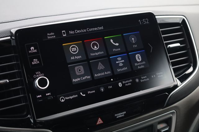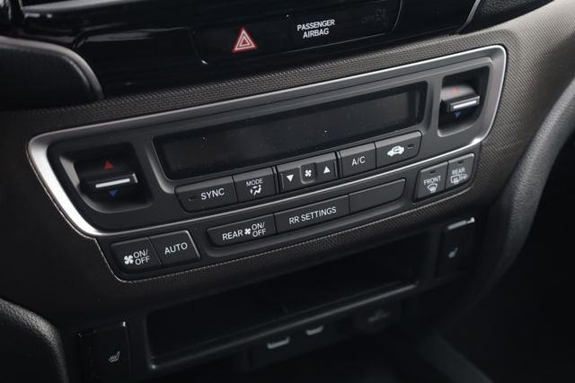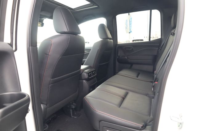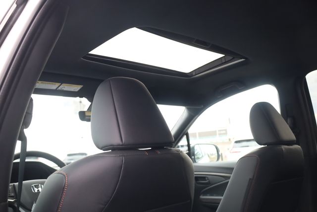 This Ridgeline is well equipped with Black Leather, 4-Wheel Disc Brakes, 4.33 Axle Ratio, 7 Speakers, ABS brakes, Air Conditioning, Alloy wheels, AM/FM radio: SiriusXM, Auto-dimming Rear-View mirror, Automatic temperature control, Blind Spot Information (BSI) System warning, Bluetooth® Hands-Free Link, Brake assist, Bumpers: body-color, Compass, Delay-off headlights, Driver door bin, Driver vanity mirror, Driver's Seat Mounted Armrest, Dual front impact airbags, Dual front side impact airbags, Electronic Stability Control, Emergency communication system: HondaLink Assist, Exterior Parking Camera Rear, Four wheel independent suspension, Front anti-roll bar, Front Bucket Seats, Front dual zone A/C, Front fog lights, Front reading lights, Fully automatic headlights, Garage door transmitter: HomeLink, Heated door mirrors, Heated Front Bucket Seats, Heated front seats, Heated steering wheel, Honda Satellite-Linked Navigation System, Illuminated entry, Leather Seat Trim, Leather steering wheel, Low tire pressure warning, Memory seat, Navigation system: Honda Satellite-Linked Navigation System, Occupant sensing airbag, Outside temperature display, Overhead airbag, Overhead console, Panic alarm, Passenger door bin, Passenger seat mounted armrest, Passenger vanity mirror, Power door mirrors, Power driver seat, Power moonroof, Power passenger seat, Power steering, Power windows, Radio data system, Radio: 215-Watt Audio System with 7 Speakers, Rear air conditioning, Rear anti-roll bar, Rear reading lights, Rear seat center armrest, Rear step bumper, Rear window defroster, Remote keyless entry, Security system, SiriusXM, Speed control, Speed-sensing steering, Split folding rear seat, Steering wheel mounted audio controls, Tachometer, Telescoping steering wheel, Tilt steering wheel, Traction control, Trip computer, Turn signal indicator mirrors, Variably intermittent wipers, and Wheels: 18" Trailsport Shark Gray Alloy.
