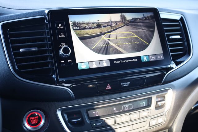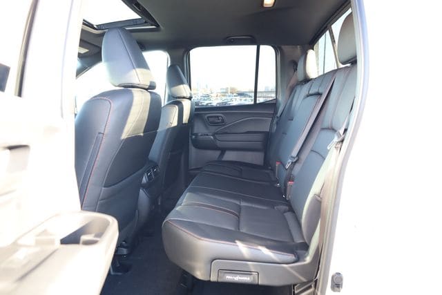 This Ridgeline is well equipped with Black Leather, 4-Wheel Disc Brakes, 4.33 Axle Ratio, 7 Speakers, ABS brakes, Air Conditioning, Alloy wheels, AM/FM radio: SiriusXM, Auto-dimming Rear-View mirror, Automatic temperature control, Blind Spot Information (BSI) System warning, Bluetooth® Hands-Free Link, Brake assist, Bumpers: body-color, Compass, Delay-off headlights, Driver door bin, Driver vanity mirror, Driver's Seat Mounted Armrest, Dual front impact airbags, Dual front side impact airbags, Electronic Stability Control, Emergency communication system: HondaLink Assist, Exterior Parking Camera Rear, Four wheel independent suspension, Front anti-roll bar, Front Bucket Seats, Front dual zone A/C, Front fog lights, Front reading lights, Fully automatic headlights, Garage door transmitter: HomeLink, Heated door mirrors, Heated Front Bucket Seats, Heated front seats, Heated steering wheel, Honda Satellite-Linked Navigation System, Illuminated entry, Leather Seat Trim, Leather steering wheel, Low tire pressure warning, Memory seat, Navigation system: Honda Satellite-Linked Navigation System, Occupant sensing airbag, Outside temperature display, Overhead airbag, Overhead console, Panic alarm, Passenger door bin, Passenger seat mounted armrest, Passenger vanity mirror, Power door mirrors, Power driver seat, Power moonroof, Power passenger seat, Power steering, Power windows, Radio data system, Radio: 215-Watt Audio System with 7 Speakers, Rear air conditioning, Rear anti-roll bar, Rear reading lights, Rear seat center armrest, Rear step bumper, Rear window defroster, Remote keyless entry, Security system, SiriusXM, Speed control, Speed-sensing steering, Split folding rear seat, Steering wheel mounted audio controls, Tachometer, Telescoping steering wheel, Tilt steering wheel, Traction control, Trip computer, Turn signal indicator mirrors, Variably intermittent wipers, and Wheels: 18" Trailsport Shark Gray Alloy.