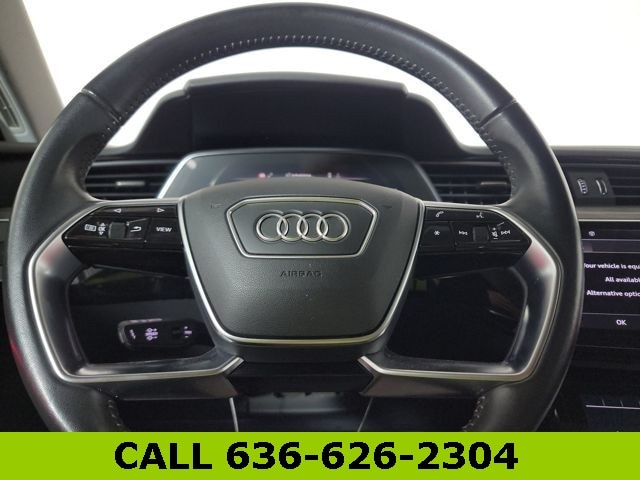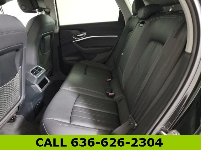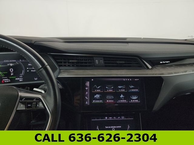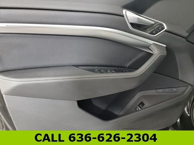 This e-tron is well equipped with Black Optic Exterior Package, Convenience Plus Package (Audi Active Lane Assist w/Emergency Assist, Audi Adaptive Cruise Assist, and Top View Camera System), 10 Speakers, 4-Wheel Disc Brakes, 9.08 Axle Ratio, ABS brakes, Adaptive suspension, Air Conditioning, Alloy wheels, Audi e-tron Beam Front & Rear Doors, Audi smartphone interface (Apple CarPlay/Android Auto), Auto High-beam Headlights, Auto-dimming door mirrors, Auto-dimming Rear-View mirror, Auto-leveling suspension, Automatic temperature control, Brake assist, Bumpers: body-color, Compass, Delay-off headlights, Driver door bin, Driver vanity mirror, Dual front impact airbags, Dual front side impact airbags, Electronic Stability Control, Emergency communication system: Audi connect CARE, PRIME & PLUS, Exterior Parking Camera Rear, Four wheel independent suspension, Front anti-roll bar, Front Bucket Seats, Front Center Armrest, Front dual zone A/C, Front fog lights, Front reading lights, Fully automatic headlights, Garage door transmitter: HomeLink, Heated 8-Way Power Front Seats, Heated door mirrors, Heated front seats, Heated steering wheel, Illuminated entry, Leather Seating Surfaces, Low tire pressure warning, Memory seat, Navigation system: Audi MMI Navigation plus with Touch Response, Occupant sensing airbag, Outside temperature display, Overhead airbag, Overhead console, Panic alarm, Passenger door bin, Passenger vanity mirror, Power door mirrors, Power driver seat, Power Liftgate, Power moonroof: Panoramic, Power passenger seat, Power steering, Power windows, Privacy Trunk Cover, Radio data system, Radio: HD FM/Sirius Satellite, Rear air conditioning, Rear anti-roll bar, Rear dual zone A/C, Rear fog lights, Rear reading lights, Rear seat center armrest, Rear window defroster, Rear window wiper, Remote keyless entry, Roof rack: rails only, Security system, Speed control, Speed-sensing steering, Split folding rear seat, Spoiler, Steering wheel memory, Steering wheel mounted audio controls, Telescoping steering wheel, Tilt steering wheel, Traction control, Trip computer, Turn signal indicator mirrors, Variably intermittent wipers, and Wheels: 20" 5-Double-Spoke Bi-Color Design.