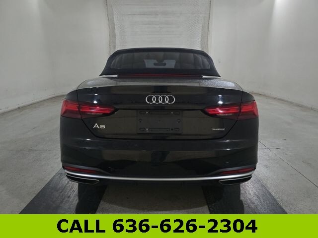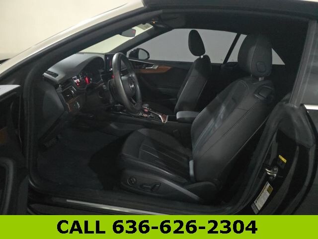 This A5 is well equipped with quattro, Black Leather, 10 Speakers, 4-Wheel Disc Brakes, ABS brakes, Air Conditioning, Alloy wheels, AM/FM radio, Anti-whiplash front head restraints, Audi Guard All-Weather Mats, Auto High-beam Headlights, Auto-dimming Rear-View mirror, Automatic temperature control, Brake assist, Bumpers: body-color, Compass, Convertible roof lining, Convertible roof wind blocker, Delay-off headlights, Driver door bin, Driver vanity mirror, Dual front impact airbags, Dual front side impact airbags, Electronic Stability Control, Emergency communication system: Audi connect CARE, Exterior Parking Camera Rear, Four wheel independent suspension, Front anti-roll bar, Front Bucket Seats, Front Center Armrest, Front dual zone A/C, Front fog lights, Front reading lights, Garage door transmitter: HomeLink, Genuine wood console insert, Genuine wood dashboard insert, Genuine wood door panel insert, Glass rear window, Heated door mirrors, Heated Front Bucket Seats, Heated front seats, Illuminated entry, Integrated roll-over protection, Integrated Toll Module Delete, Knee airbag, Leather Seating Surfaces, Leather Shift Knob, Leather steering wheel, Low tire pressure warning, Occupant sensing airbag, Outside temperature display, Panic alarm, Passenger door bin, Passenger vanity mirror, Power adjustable front head restraints, Power convertible roof, Power door mirrors, Power driver seat, Power passenger seat, Power steering, Power windows, Radio data system, Radio: Audi Sound System, Rain sensing wipers, Rear air conditioning, Rear anti-roll bar, Rear reading lights, Rear window defroster, Remote keyless entry, Rings Audi Beam, Speed control, Speed-sensing steering, Speed-Sensitive Wipers, Split folding rear seat, Steering wheel mounted audio controls, Tachometer, Telescoping steering wheel, Tilt steering wheel, Traction control, Trip computer, Turn signal indicator mirrors, Variably intermittent wipers, and Wheels: 18" 5-V-Spoke-Y Design.