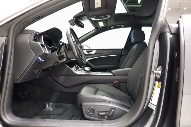 This A7 is well equipped with Audi Guard Protection Package, Convenience Package (Adaptive Cruise Assist w/Lane Guidance, Audi Phone Box w/Wireless Charging, Audi Side Assist w/Pre Sense Rear, Heated Steering Wheel, and Top View Camera System w/Virtual 360 View), 10 Speakers, 4-Wheel Disc Brakes, ABS brakes, Air Conditioning, Alloy wheels, AM/FM radio: SiriusXM w/ 360L, Auto High-beam Headlights, Auto tilt-away steering wheel, Auto-dimming door mirrors, Auto-dimming Rear-View mirror, Automatic temperature control, Brake assist, Bumpers: body-color, Compass, Delay-off headlights, Driver door bin, Driver vanity mirror, Dual front impact airbags, Dual front side impact airbags, Electronic Stability Control, Emergency communication system: Audi connect CARE (limited time subscription), Exterior Parking Camera Rear, Four wheel independent suspension, Front & Rear Doors Audi Beam-Rings, Front anti-roll bar, Front Bucket Seats, Front Center Armrest, Front dual zone A/C, Front fog lights, Front reading lights, Garage door transmitter: HomeLink, Genuine wood console insert, Genuine wood dashboard insert, Genuine wood door panel insert, Heated door mirrors, Heated Front Bucket Seats, Heated front seats, Illuminated entry, Knee airbag, Leather Seating Surfaces, Leather Shift Knob, Leather steering wheel, Low tire pressure warning, Memory seat, Navigation system: MMI Navigation plus, Occupant sensing airbag, Outside temperature display, Overhead airbag, Overhead console, Panic alarm, Passenger door bin, Passenger vanity mirror, Power door mirrors, Power driver seat, Power Liftgate, Power moonroof, Power passenger seat, Power steering, Power windows, Radio data system, Radio: Audi MMI Navigation Plus, Rain sensing wipers, Rear air conditioning, Rear anti-roll bar, Rear fog lights, Rear reading lights, Rear seat center armrest, Rear side impact airbag, Rear window defroster, Remote keyless entry, Security system, Speed control, Speed-sensing steering, Speed-Sensitive Wipers, Split folding rear seat, Spoiler, Steering wheel memory, Steering wheel mounted audio controls, Tachometer, Telescoping steering wheel, Tilt steering wheel, Traction control, Trip computer, Turn signal indicator mirrors, Variably intermittent wipers, and Wheels: 20" 5-Double-Arm Design.