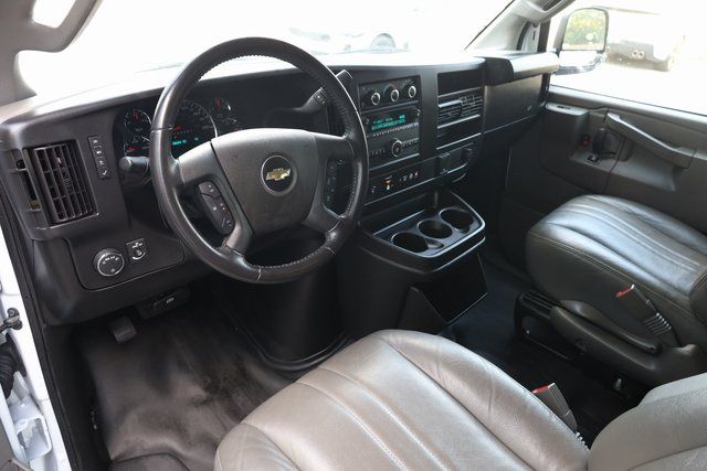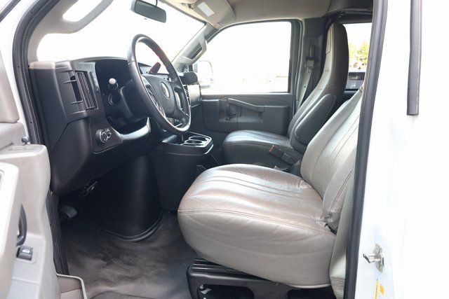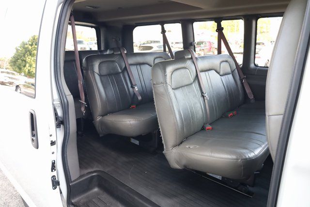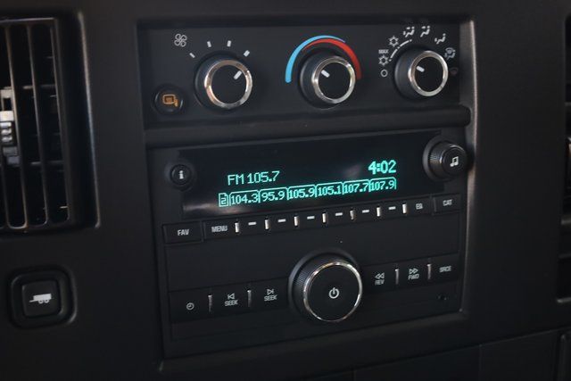 This Express 3500 is well equipped with Preferred Equipment Group 1LS, 12-Passenger Seating (2-3-3-4 Seating Config), 16" x 6.5" Steel Wheels, 2 Speakers, 3.42 Rear Axle Ratio, 3rd row seats: bench, 4-Wheel Disc Brakes, 4th-Row Bench Seat, ABS brakes, Air Conditioning, AM/FM radio, AM/FM Stereo w/MP3 Player, Bluetooth® For Phone, Compass, Custom Vinyl Seat Trim, Delay-off headlights, Driver door bin, Driver vanity mirror, Driver's Seat Mounted Armrest, Dual front impact airbags, Dual front side impact airbags, Electronic Stability Control, Emergency communication system: OnStar and Chevrolet connected services capable, Front anti-roll bar, Front Bucket Seats, Front reading lights, Front Reclining High-Back Bucket Seats, Front wheel independent suspension, Fully automatic headlights, Heated door mirrors, Leather-Wrapped Steering Wheel, Low tire pressure warning, Occupant sensing airbag, Overhead airbag, Passenger cancellable airbag, Passenger door bin, Passenger seat mounted armrest, Passenger vanity mirror, Power door mirrors, Power steering, Power windows, Rear air conditioning, Rear Park Assist, Rear reading lights, Side Blind Zone Alert, Sliding Passenger-Side Door, Speed control, Steering Wheel Mounted Audio Controls, Tachometer, Tilt steering wheel, Traction control, Trip computer, Variably intermittent wipers, and Voltmeter.