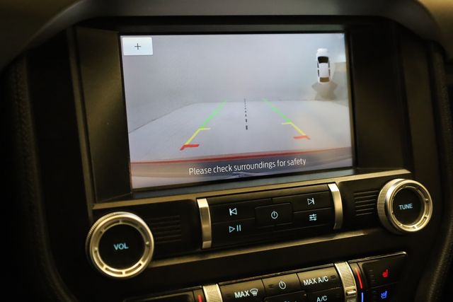 This Mustang is well equipped with 4-Wheel Disc Brakes, ABS brakes, Air Conditioning, Alloy wheels, AM/FM Stereo, Auto-dimming Rear-View mirror, Brake assist, Bumpers: body-color, Compass, Convertible roof lining, Delay-off headlights, Driver door bin, Driver vanity mirror, Dual front impact airbags, Dual front side impact airbags, Electronic Stability Control, Emergency communication system: 911 Assist, Exterior Parking Camera Rear, Four wheel independent suspension, Front anti-roll bar, Front Bucket Seats, Front Center Armrest, Front reading lights, Fully automatic headlights, Glass rear window, Illuminated entry, Knee airbag, Leather Shift Knob, Low tire pressure warning, Occupant sensing airbag, Outside temperature display, Overhead console, Panic alarm, Passenger door bin, Passenger vanity mirror, Power convertible roof, Power door mirrors, Power steering, Power windows, Radio data system, Rear anti-roll bar, Rear window defroster, Remote keyless entry, Security system, SiriusXM Radio, Speed control, Speed-sensing steering, Speed-Sensitive Wipers, Steering wheel mounted audio controls, SYNC 3 Communications & Entertainment System, Tachometer, Telescoping steering wheel, Tilt steering wheel, Traction control, Trip computer, Variably intermittent wipers, Voltmeter, and Wheels: 18" x 8" Machined-Face Aluminum.