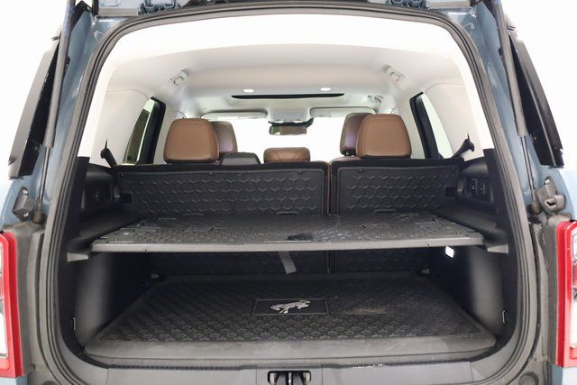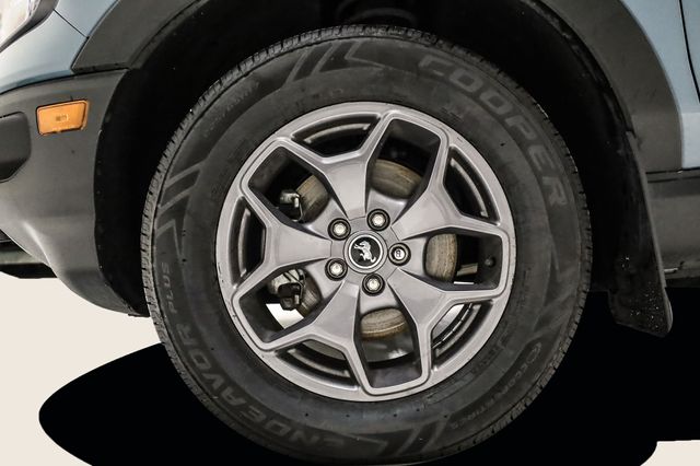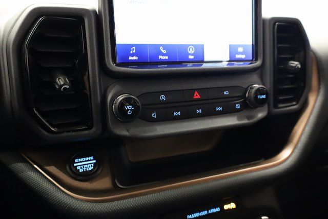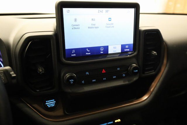 This Bronco Sport is well equipped with 3.80 Axle Ratio, 4-Wheel Disc Brakes, 6 Speakers, ABS brakes, Air Conditioning, Alloy wheels, AM/FM radio: SiriusXM, AM/FM Stereo, Auto High-beam Headlights, Automatic temperature control, Brake assist, Compass, Delay-off headlights, Driver door bin, Driver vanity mirror, Dual front impact airbags, Dual front side impact airbags, Electronic Stability Control, Emergency communication system: SYNC 3 911 Assist, Four wheel independent suspension, Front anti-roll bar, Front Bucket Seats, Front Center Armrest, Front fog lights, Front reading lights, Fully automatic headlights, Heated door mirrors, Heated front seats, Illuminated entry, Knee airbag, Low tire pressure warning, Occupant sensing airbag, Outside temperature display, Overhead airbag, Overhead console, Panic alarm, Passenger door bin, Passenger vanity mirror, Power door mirrors, Power driver seat, Power steering, Power windows, Radio data system, Rear anti-roll bar, Rear reading lights, Rear seat center armrest, Rear window defroster, Rear window wiper, Remote keyless entry, Roof rack: rails only, Security system, SiriusXM Radio, Speed control, Speed-sensing steering, Speed-Sensitive Wipers, Split folding rear seat, Steering wheel mounted audio controls, SYNC 3 Communications & Entertainment System, SYNC 3/Apple CarPlay/Android Auto, Tachometer, Telescoping steering wheel, Tilt steering wheel, Traction control, Trip computer, Unique Cloth Heated Sport Contour Bucket Seats, Variably intermittent wipers, and Wheels: 17" Carbonized Gray-Painted Aluminum.