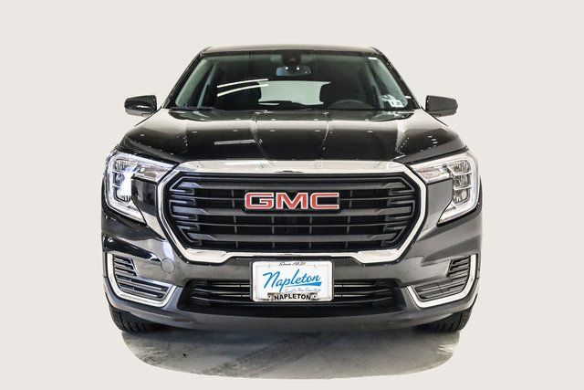 This Terrain is well equipped with License Plate Front Mounting Package, Preferred Equipment Group 3SA, AWD, 2 USB Data Ports w/Auxiliary Input Jack, 3.47 Axle Ratio, 4-Way Manual Driver's Seat, 4-Way Manual Front Passenger Seat, 4-Wheel Disc Brakes, 4.2" Multi-Color Driver Information Screen, 6 Speakers, 6-Speaker Audio System Feature, ABS brakes, Air Conditioning, Alloy wheels, AM/FM radio: SiriusXM, Auto High-beam Headlights, Auto-dimming Rear-View mirror, Automatic temperature control, Bluetooth® For Phone, Brake assist, Bumpers: body-color, Compass, Delay-off headlights, Driver door bin, Driver vanity mirror, Dual front impact airbags, Dual front side impact airbags, Electronic Stability Control, Emergency communication system: OnStar Guidance, Four wheel independent suspension, Front anti-roll bar, Front Bucket Seats, Front Center Armrest, Front reading lights, Fully automatic headlights, Heated door mirrors, Illuminated entry, Lane Departure Warning System, Low tire pressure warning, Occupant sensing airbag, Outside temperature display, Overhead airbag, Overhead console, Panic alarm, Passenger door bin, Passenger vanity mirror, Power door mirrors, Power steering, Power windows, Premium Cloth Seat Trim, Radio data system, Radio: GMC Infotainment Audio System w/7" Display, Rear anti-roll bar, Rear seat center armrest, Rear window defroster, Rear window wiper, Remote keyless entry, Security system, SiriusXM Radio, Speed control, Speed-sensing steering, Split folding rear seat, Spoiler, Steering wheel mounted audio controls, Tachometer, Telescoping steering wheel, Tilt steering wheel, Traction control, Trip computer, Variably intermittent wipers, Wheels: 17" x 7" Silver Painted Aluminum, and Wireless Apple CarPlay/Wireless Android Auto.