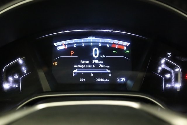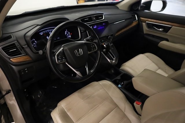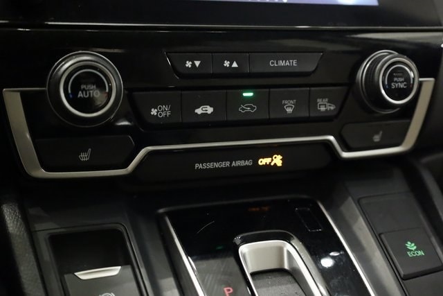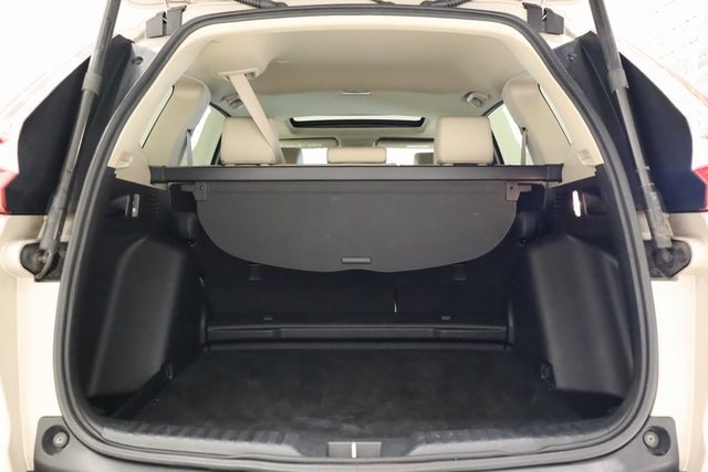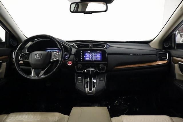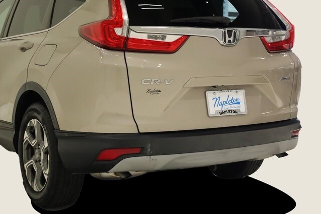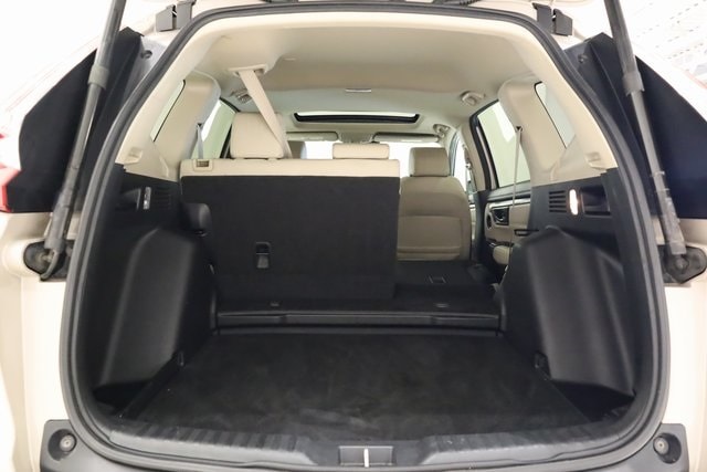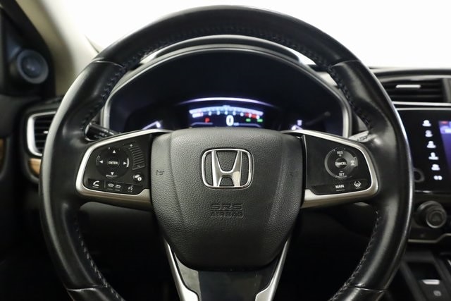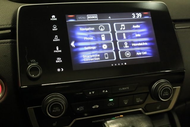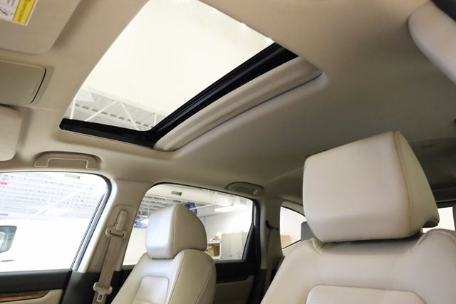 This CR-V is well equipped with AWD, 18" Alloy Wheels, 4-Wheel Disc Brakes, 5.64 Axle Ratio, 8 Speakers, ABS brakes, Air Conditioning, Alloy wheels, AM/FM radio: SiriusXM, Apple CarPlay/Android Auto, Auto High-beam Headlights, Auto-dimming Rear-View mirror, Automatic temperature control, Blind Spot Information (BSI) System warning, Brake assist, Bumpers: body-color, Compass, Delay-off headlights, Driver door bin, Driver vanity mirror, Dual front impact airbags, Dual front side impact airbags, Electronic Stability Control, Exterior Parking Camera Rear, Four wheel independent suspension, Front anti-roll bar, Front Bucket Seats, Front Center Armrest, Front dual zone A/C, Front fog lights, Front reading lights, Fully automatic headlights, Garage door transmitter: HomeLink, Heated door mirrors, Heated Front Bucket Seats, Heated front seats, Illuminated entry, Leather Seat Trim, Leather Shift Knob, Low tire pressure warning, Memory seat, Occupant sensing airbag, Outside temperature display, Overhead airbag, Overhead console, Panic alarm, Passenger door bin, Passenger vanity mirror, Power door mirrors, Power driver seat, Power Liftgate, Power moonroof, Power passenger seat, Power steering, Power windows, Radio data system, Radio: AM/FM/HD/SiriusXM Audio System, Rear anti-roll bar, Rear seat center armrest, Rear window defroster, Rear window wiper, Remote keyless entry, Security system, Speed control, Speed-sensing steering, Speed-Sensitive Wipers, Split folding rear seat, Spoiler, Steering wheel mounted audio controls, Tachometer, Telescoping steering wheel, Tilt steering wheel, Traction control, Trip computer, Turn signal indicator mirrors, and Variably intermittent wipers.