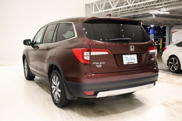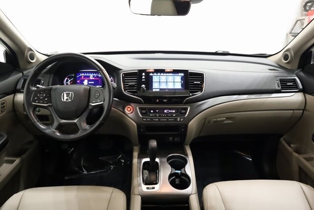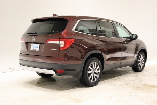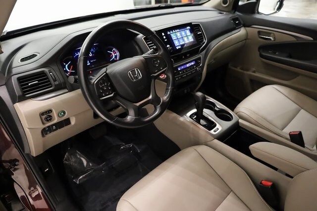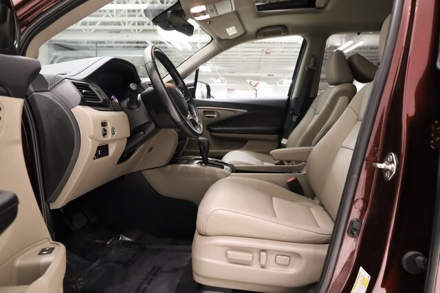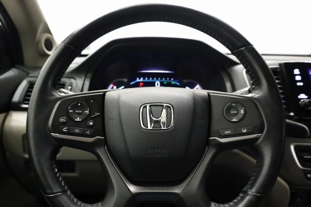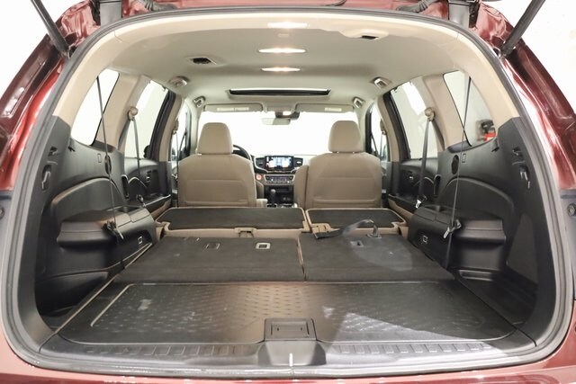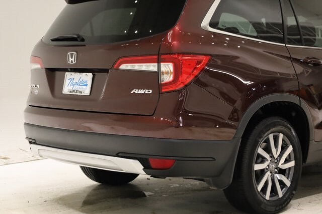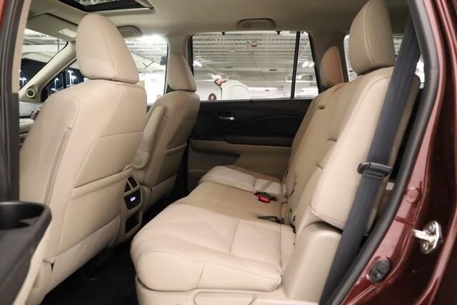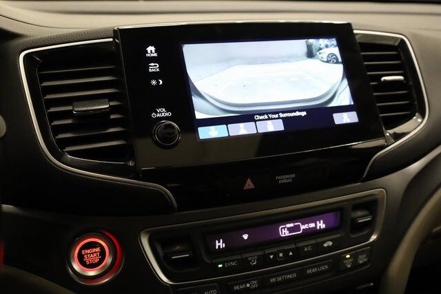 This Pilot is well equipped with AWD, 18" Machine-Finished Alloy Wheels, 3rd row seats: split-bench, 4-Wheel Disc Brakes, 4.25 Axle Ratio, 7 Speakers, A/V remote: CabinControl, ABS brakes, Air Conditioning, Alloy wheels, AM/FM radio: SiriusXM, Apple CarPlay/Android Auto, Auto High-beam Headlights, Auto-dimming Rear-View mirror, Automatic temperature control, Blind Spot Information (BSI) System warning, Brake assist, Bumpers: body-color, Delay-off headlights, Driver door bin, Driver vanity mirror, Dual front impact airbags, Dual front side impact airbags, Electronic Stability Control, Emergency communication system: HondaLink Assist, Exterior Parking Camera Rear, Forward collision: Collision Mitigation Braking System (CMBS) + FCW mitigation, Four wheel independent suspension, Front anti-roll bar, Front Bucket Seats, Front Center Armrest, Front dual zone A/C, Front fog lights, Front reading lights, Fully automatic headlights, Garage door transmitter: HomeLink, Heated door mirrors, Heated Front Bucket Seats, Heated front seats, Illuminated entry, Lane departure: Lane Keeping Assist System (LKAS) active, Leather Shift Knob, Leather-Trimmed Seats, Low tire pressure warning, Memory seat, Occupant sensing airbag, Outside temperature display, Overhead airbag, Overhead console, Panic alarm, Passenger door bin, Passenger vanity mirror, Power door mirrors, Power driver seat, Power Liftgate, Power moonroof, Power passenger seat, Power steering, Power windows, Radio data system, Radio: AM/FM Audio System, Rear air conditioning, Rear anti-roll bar, Rear reading lights, Rear seat center armrest, Rear window defroster, Rear window wiper, Reclining 3rd row seat, Remote keyless entry, Security system, Speed control, Speed-sensing steering, Speed-Sensitive Wipers, Split folding rear seat, Spoiler, Steering wheel mounted audio controls, Tachometer, Telescoping steering wheel, Tilt steering wheel, Traction control, Trip computer, Turn signal indicator mirrors, and Variably intermittent wipers.