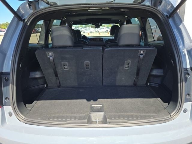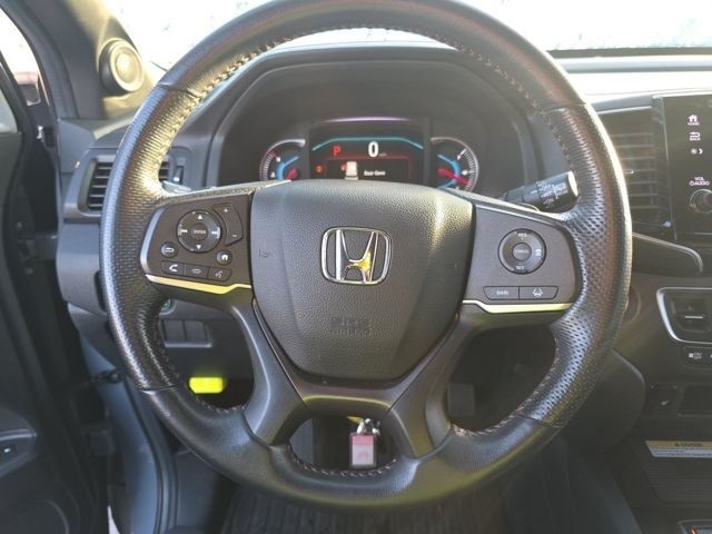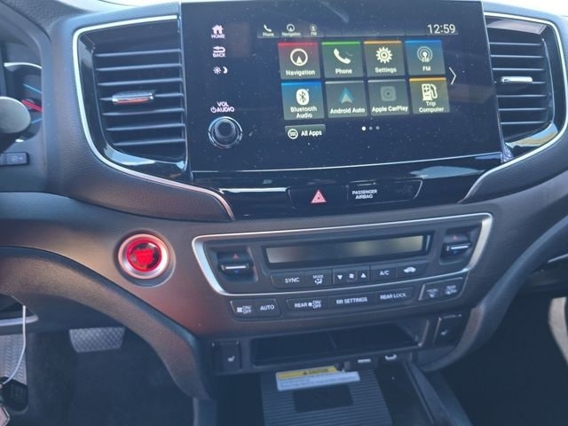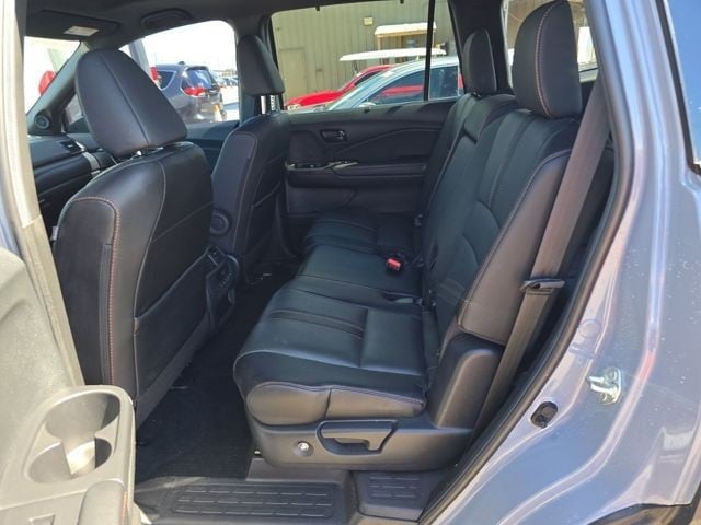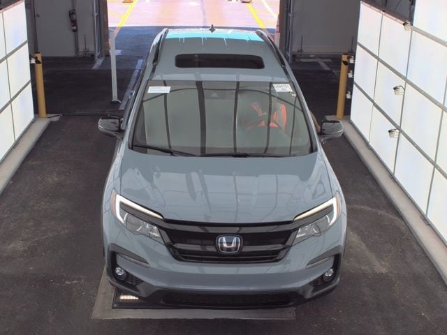 This Pilot is well equipped with AWD, 3rd row seats: split-bench, 4-Wheel Disc Brakes, 4.33 Axle Ratio, 7 Speakers, A/V remote: CabinControl, ABS brakes, Air Conditioning, Alloy wheels, AM/FM radio: SiriusXM, Apple CarPlay/Android Auto, Auto High-beam Headlights, Auto-dimming Rear-View mirror, Automatic temperature control, Blind Spot Information (BSI) System warning, Brake assist, Bumpers: body-color, Delay-off headlights, Driver door bin, Driver vanity mirror, Dual front impact airbags, Dual front side impact airbags, Electronic Stability Control, Emergency communication system: HondaLink Assist, Exterior Parking Camera Rear, Forward collision: Collision Mitigation Braking System (CMBS) + FCW mitigation, Four wheel independent suspension, Front anti-roll bar, Front Bucket Seats, Front Center Armrest, Front dual zone A/C, Front fog lights, Front reading lights, Fully automatic headlights, Garage door transmitter: HomeLink, Heated door mirrors, Heated Front Bucket Seats, Heated front seats, Illuminated entry, Lane departure: Lane Keeping Assist System (LKAS) active, Leather Seat Trim, Low tire pressure warning, Memory seat, Navigation system: Honda Satellite-Linked Navigation System, Occupant sensing airbag, Outside temperature display, Overhead airbag, Overhead console, Panic alarm, Passenger door bin, Passenger vanity mirror, Power door mirrors, Power driver seat, Power Liftgate, Power moonroof, Power passenger seat, Power steering, Power windows, Radio data system, Radio: 215-Watt Audio System, Rear air conditioning, Rear anti-roll bar, Rear reading lights, Rear seat center armrest, Rear window defroster, Rear window wiper, Reclining 3rd row seat, Remote keyless entry, Roof rack: rails only, Security system, Speed control, Speed-sensing steering, Speed-Sensitive Wipers, Split folding rear seat, Spoiler, Steering wheel mounted audio controls, Tachometer, Telescoping steering wheel, Tilt steering wheel, Traction control, Trip computer, Turn signal indicator mirrors, Variably intermittent wipers, and Wheels: 18" Exclusive Gloss Black Alloy.