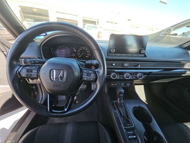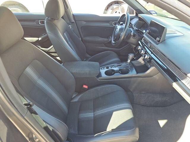 This Civic is well equipped with Black w/Cloth Seating Surfaces, 4-Wheel Disc Brakes, 8 Speakers, ABS brakes, Adaptive Cruise Control: Adaptive Cruise Control (ACC) with Low-Speed Follow, Air Conditioning, Alloy wheels, AM/FM radio, Apple CarPlay/Android Auto, Auto High-beam Headlights, Automatic temperature control, Brake assist, Bumpers: body-color, Cloth/Leatherette Seating Surfaces, Delay-off headlights, Driver door bin, Driver vanity mirror, Dual front impact airbags, Dual front side impact airbags, Electronic Stability Control, Emergency communication system: HondaLink, Exterior Parking Camera Rear, Four wheel independent suspension, Front anti-roll bar, Front Bucket Seats, Front Center Armrest, Front reading lights, Fully automatic headlights, Illuminated entry, Knee airbag, Leather Shift Knob, Leather steering wheel, Low tire pressure warning, Occupant sensing airbag, Outside temperature display, Overhead airbag, Panic alarm, Passenger door bin, Passenger vanity mirror, Power door mirrors, Power steering, Power windows, Radio data system, Radio: 180-Watt Audio System, Rear anti-roll bar, Rear side impact airbag, Rear window defroster, Remote keyless entry, Security system, Speed control, Speed-sensing steering, Steering wheel mounted audio controls, Tachometer, Telescoping steering wheel, Tilt steering wheel, Traction control, Trip computer, and Wheels: 18" Gloss Black Alloy.