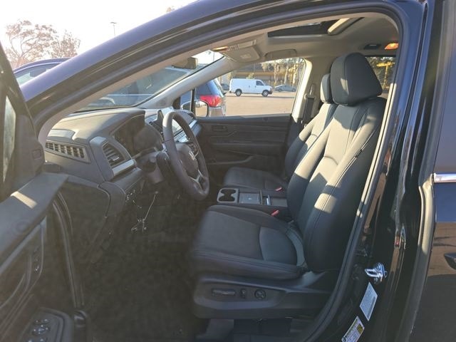 This Odyssey is well equipped with 18" Machine-Finished Alloy Wheels, 3rd row seats: split-bench, 4-Wheel Disc Brakes, 7 Speakers, ABS brakes, Adaptive Cruise Control: Adaptive Cruise Control (ACC) with Low-Speed Follow, Air Conditioning, Alloy wheels, AM/FM radio: SiriusXM, Anti-whiplash front head restraints, Apple CarPlay/Android Auto, Auto High-beam Headlights, Auto-dimming Rear-View mirror, Automatic temperature control, Blind Spot Information (BSI) System warning, Brake assist, Bumpers: body-color, Delay-off headlights, Driver door bin, Driver vanity mirror, Driver's Seat Mounted Armrest, Dual front impact airbags, Dual front side impact airbags, Electronic Stability Control, Exterior Parking Camera Rear, Four wheel independent suspension, Front anti-roll bar, Front Bucket Seats, Front dual zone A/C, Front fog lights, Front reading lights, Fully automatic headlights, Garage door transmitter: HomeLink, Heated door mirrors, Heated Front Bucket Seats, Heated front seats, Illuminated entry, Knee airbag, Lane departure: Lane Keeping Assist System (LKAS) active, Leather steering wheel, Leather Trimmed Seats, Low tire pressure warning, Memory seat, Occupant sensing airbag, Outside temperature display, Overhead airbag, Overhead console, Panic alarm, Passenger door bin, Passenger seat mounted armrest, Passenger vanity mirror, Power door mirrors, Power driver seat, Power Liftgate, Power moonroof, Power passenger seat, Power steering, Power windows, Radio data system, Radio: 160-Watt AM/FM/HD/SiriusXM Audio System, Rear air conditioning, Rear anti-roll bar, Rear reading lights, Rear seat center armrest, Rear window defroster, Rear window wiper, Reclining 3rd row seat, Remote keyless entry, Security system, Speed control, Speed-sensing steering, Speed-Sensitive Wipers, Split folding rear seat, Spoiler, Steering wheel mounted audio controls, Tachometer, Telescoping steering wheel, Tilt steering wheel, Traction control, Trip computer, Turn signal indicator mirrors, and Variably intermittent wipers.