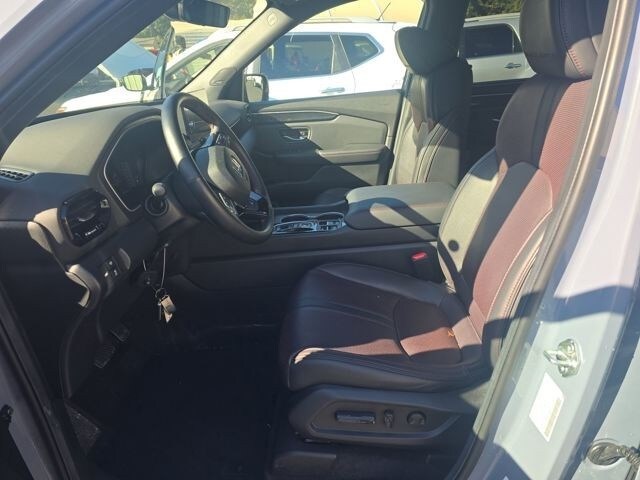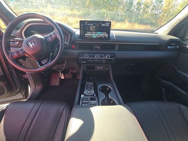 This Pilot is well equipped with AWD, 12 Speakers, 3rd row seats: split-bench, 4-Wheel Disc Brakes, 4.167 Axle Ratio, ABS brakes, Adaptive Cruise Control: Adaptive Cruise Control (ACC) with Low-Speed Follow, Air Conditioning, Alloy wheels, AM/FM radio: SiriusXM, Apple CarPlay/Android Auto, Auto High-beam Headlights, Auto-dimming door mirrors, Auto-dimming Rear-View mirror, Automatic temperature control, Blind Spot Information (BSI) System warning, Bose Premium Sound System, Brake assist, Bumpers: body-color, Compass, Delay-off headlights, Driver door bin, Driver vanity mirror, Dual front impact airbags, Dual front side impact airbags, Electronic Stability Control, Emergency communication system: HondaLink, Exterior Parking Camera Rear, Four wheel independent suspension, Front anti-roll bar, Front Bucket Seats, Front Center Armrest, Front dual zone A/C, Front fog lights, Front reading lights, Fully automatic headlights, Garage door transmitter: HomeLink, Heads-Up Display, Heated & Ventilated Front Bucket Seats, Heated door mirrors, Heated front seats, Heated rear seats, Heated steering wheel, Honda Satellite-Linked Navigation System, HondaLink Subscription Services, Illuminated entry, Knee airbag, Lane departure: Lane Keeping Assist System (LKAS) active, Low tire pressure warning, Memory seat, Navigation system: Honda Satellite-Linked Navigation System, Occupant sensing airbag, Outside temperature display, Overhead airbag, Overhead console, Panic alarm, Passenger door bin, Passenger vanity mirror, Perforated Leather Seat Trim, Power door mirrors, Power driver seat, Power Liftgate, Power moonroof, Power passenger seat, Power steering, Power windows, Radio data system, Rain sensing wipers, Rear air conditioning, Rear anti-roll bar, Rear reading lights, Rear seat center armrest, Rear window defroster, Rear window wiper, Reclining 3rd row seat, Remote keyless entry, Security system, SiriusXM, Speed control, Speed-sensing steering, Speed-Sensitive Wipers, Split folding rear seat, Spoiler, Steering wheel mounted audio controls, Tachometer, Telescoping steering wheel, Tilt steering wheel, Traction control, Trip computer, Turn signal indicator mirrors, Variably intermittent wipers, Ventilated front seats, and Wheels: 20" Gloss Black w/Black Lug Nuts.