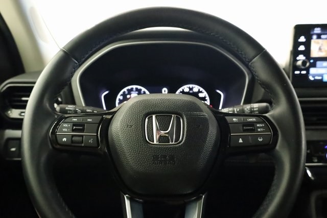 This Pilot is well equipped with AWD, 3rd row seats: split-bench, 4-Wheel Disc Brakes, 4.167 Axle Ratio, 9 Speakers, ABS brakes, Adaptive Cruise Control: Adaptive Cruise Control (ACC) with Low-Speed Follow, Air Conditioning, Alloy wheels, AM/FM radio: SiriusXM, Apple CarPlay/Android Auto, Auto High-beam Headlights, Auto-dimming Rear-View mirror, Automatic temperature control, Blind Spot Information (BSI) System warning, Brake assist, Bumpers: body-color, Delay-off headlights, Driver door bin, Driver vanity mirror, Dual front impact airbags, Dual front side impact airbags, Electronic Stability Control, Emergency communication system: HondaLink Assist, Exterior Parking Camera Rear, Four wheel independent suspension, Front anti-roll bar, Front Bucket Seats, Front Center Armrest, Front dual zone A/C, Front fog lights, Front reading lights, Fully automatic headlights, Garage door transmitter: HomeLink, Heated door mirrors, Heated Front Bucket Seats, Heated front seats, Illuminated entry, Knee airbag, Lane departure: Lane Keeping Assist System (LKAS) active, Leather Seat Trim, Low tire pressure warning, Memory seat, Occupant sensing airbag, Outside temperature display, Overhead airbag, Overhead console, Panic alarm, Passenger door bin, Passenger vanity mirror, Power door mirrors, Power driver seat, Power Liftgate, Power passenger seat, Power steering, Power windows, Radio data system, Radio: 245-Watt Audio System, Rear air conditioning, Rear anti-roll bar, Rear reading lights, Rear seat center armrest, Rear window defroster, Rear window wiper, Reclining 3rd row seat, Remote keyless entry, Security system, SiriusXM, Speed control, Speed-sensing steering, Speed-Sensitive Wipers, Split folding rear seat, Spoiler, Steering wheel mounted audio controls, Tachometer, Telescoping steering wheel, Tilt steering wheel, Traction control, Trip computer, Turn signal indicator mirrors, Variably intermittent wipers, and Wheels: 18" Pewter Gray Machined Face.