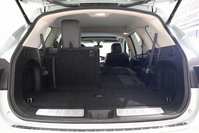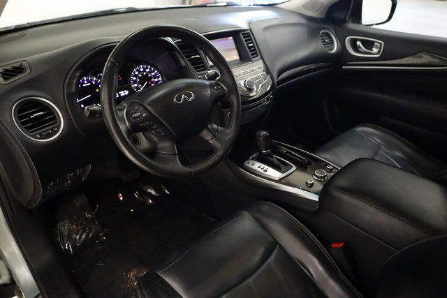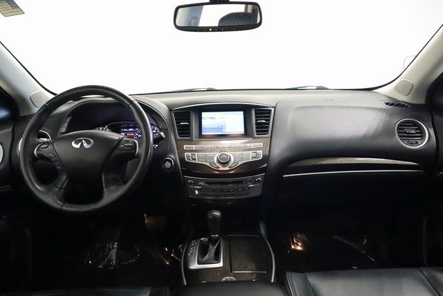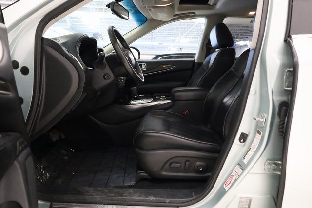 This QX60 is well equipped with Cargo Package (PIO) (First Aid Kit, Rear Cargo Protector, and Tonneau Cover), Premium Package (2-Way Driver's Seat Power Lumbar Support, Dual Occupant Memory System, Enhanced Intelligent Key Memory, Entry & Exit Assist, Heated Steering Wheel, Outside Mirrors w/Reverse Tilt-Down Feature, Radio: AM/FM/CD/DVD w/MP3 Playback Capability, and Remote Engine Start), 18" Split 5-Spoke Aluminum-Alloy Wheels, 3rd row seats: bench, 4-Wheel Disc Brakes, 5.17 Axle Ratio, 6 Speakers, ABS brakes, Activation Disclaimer, Air Conditioning, Alloy wheels, AM/FM radio: SiriusXM, AM/FM/CD/MP3 Audio System, Auto-dimming Rear-View mirror, Automatic temperature control, Bodyside moldings, Brake assist, Bumpers: body-color, CD player, Delay-off headlights, Driver door bin, Driver vanity mirror, Dual front impact airbags, Dual front side impact airbags, Electronic Stability Control, Exterior Parking Camera Rear, Floor Mats, Four wheel independent suspension, Front anti-roll bar, Front Bucket Seats, Front Center Armrest w/Storage, Front dual zone A/C, Front fog lights, Front reading lights, Fully automatic headlights, Garage door transmitter, Heated door mirrors, Heated Front Seats, Heated front seats, High intensity discharge headlights: Bi-Xenon, Illuminated entry, Leather Shift Knob, Leather steering wheel, Leather-Appointed Seats, Literature Kit, Low tire pressure warning, Occupant sensing airbag, Outside temperature display, Overhead airbag, Overhead console, Panic alarm, Passenger door bin, Passenger vanity mirror, Power door mirrors, Power driver seat, Power Liftgate, Power moonroof, Power passenger seat, Power steering, Power windows, Radio data system, Rear air conditioning, Rear anti-roll bar, Rear Bumper Protector, Rear reading lights, Rear seat center armrest, Rear window defroster, Rear window wiper, Reclining 3rd row seat, Remote keyless entry, Security system, Speed control, Speed-sensing steering, Speed-Sensitive Wipers, Split folding rear seat, Spoiler, Steering wheel mounted audio controls, Tachometer, Telescoping steering wheel, Tilt steering wheel, Traction control, Trip computer, and Variably intermittent wipers.