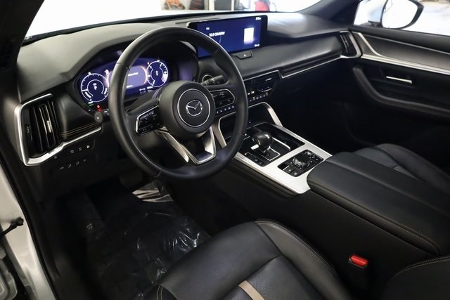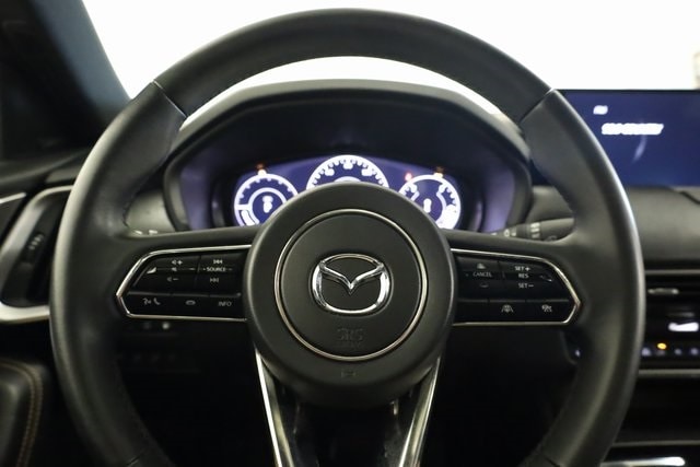 This Mazda CX-90 PHEV is well equipped with 2.5L 4-Cylinder, 12 Speakers, 3rd row seats: bench, 4-Wheel Disc Brakes, ABS brakes, Air Conditioning, Alloy wheels, AM/FM radio: SiriusXM, Auto High-beam Headlights, Auto-dimming door mirrors, Auto-dimming Rear-View mirror, Automatic temperature control, Brake assist, Bumpers: body-color, Compass, Delay-off headlights, Driver door bin, Driver vanity mirror, Dual front impact airbags, Dual front side impact airbags, E911 Automatic Emergency Notification, Electronic Stability Control, Emergency communication system: MAZDA CONNECT, Four wheel independent suspension, Front anti-roll bar, Front Bucket Seats, Front Center Armrest w/Storage, Front dual zone A/C, Front reading lights, Fully automatic headlights, Garage door transmitter: HomeLink, Heads-Up Display, Heated door mirrors, Heated front seats, Heated rear seats, Heated steering wheel, Heated/Ventilated Front Bucket Seats, Illuminated entry, Infotainment System Voice Command, Knee airbag, Leather Shift Knob, Leather steering wheel, Low tire pressure warning, Mazda Connected Services, Mazda Navigation System, Memory seat, Nappa Leather Seat Trim, Navigation system: MAZDA CONNECT, Occupant sensing airbag, Outside temperature display, Overhead airbag, Overhead console, Pandora Internet Radio Integration, Panic alarm, Passenger door bin, Passenger vanity mirror, Power door mirrors, Power driver seat, Power Liftgate, Power moonroof, Power passenger seat, Power steering, Power windows, Radio Broadcast Data System Program Information, Radio data system, Radio: AM/FM w/HD/Bose 12-Speaker Sound System, Rain sensing wipers, Rear air conditioning, Rear anti-roll bar, Rear reading lights, Rear window defroster, Rear window wiper, Remote keyless entry, Security system, SMS Text Msg Audio Delivery & Reply, Speed control, Speed-sensing steering, Split folding rear seat, Spoiler, Steering wheel mounted audio controls, Tachometer, Telescoping steering wheel, Tilt steering wheel, Traction control, Trip computer, Turn signal indicator mirrors, Variably intermittent wipers, Ventilated front seats, and Wheels: 21" x 9.5J Aluminum Alloy.