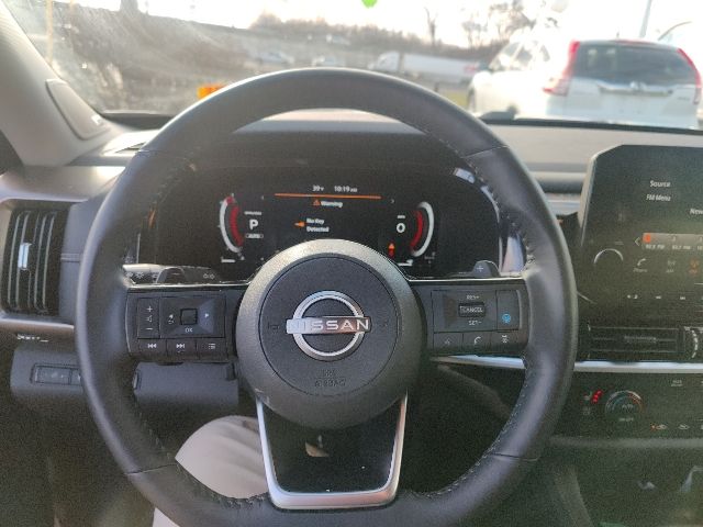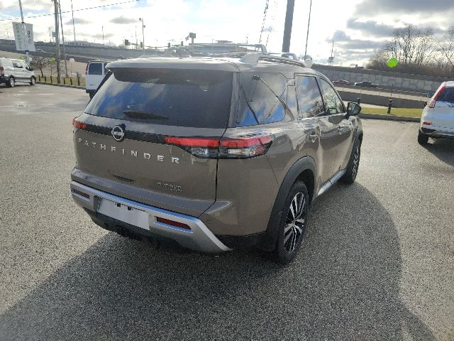 This Pathfinder is well equipped with Cargo Package (Cargo Area Protector, Cargo Net, and First Aid Kit), Platinum Captain Chairs Package (2nd-Row Captain Chairs and 2nd-Row Rear Headrest), 4WD, 13 Speakers, 3rd row seats: bench, 4-Wheel Disc Brakes, ABS brakes, Air Conditioning, Alloy wheels, AM/FM radio: SiriusXM, Auto High-beam Headlights, Auto tilt-away steering wheel, Auto-dimming Rear-View mirror, Automatic temperature control, Axle Ratio: 4.334, Black Splash Guards (Set of 4), Bodyside moldings, Bose Premium Audio System, Brake assist, Bumpers: body-color, Captain's Chairs Carpeted Floor Mats (Set of 4), Cross Bars, Delay-off headlights, Driver door bin, Driver vanity mirror, Dual front impact airbags, Dual front side impact airbags, Electronic Stability Control, Emergency communication system, Exterior Parking Camera Rear, Four wheel independent suspension, Front anti-roll bar, Front Bucket Seats, Front Center Armrest, Front dual zone A/C, Front reading lights, Fully automatic headlights, Garage door transmitter: HomeLink, Heads-Up Display, Heated & Cooled Front Bucket Seats, Heated door mirrors, Heated front seats, Heated rear seats, Heated steering wheel, Illuminated entry, Knee airbag, Leather steering wheel, Low tire pressure warning, Memory seat, Navigation system: NissanConnect with Navigation and Services, Nissan USB Charging Cable Set, NissanConnect featuring Apple CarPlay and Android Auto, NissanConnect w/Navigation & Services, Occupant sensing airbag, Outside temperature display, Overhead airbag, Overhead console, Panic alarm, Passenger door bin, Passenger vanity mirror, Power door mirrors, Power driver seat, Power Liftgate, Power moonroof, Power passenger seat, Power steering, Power windows, Radio data system, Radio: AM/FM Audio System, Rain sensing wipers, Rear air conditioning, Rear anti-roll bar, Rear reading lights, Rear seat center armrest, Rear side impact airbag, Rear window defroster, Rear window wiper, Reclining 3rd row seat, Remote keyless entry, Security system, Semi-Aniline Leather-Appointed Seating Surfaces, Speed control, Speed-sensing steering, Speed-Sensitive Wipers, Split folding rear seat, Spoiler, Steering wheel memory, Steering wheel mounted audio controls, Tachometer, Telescoping steering wheel, Tilt steering wheel, Traction control, Trip computer, Turn signal indicator mirrors, Variably intermittent wipers, Ventilated front seats, and Wheels: 20" x 8J Machined Alloy.