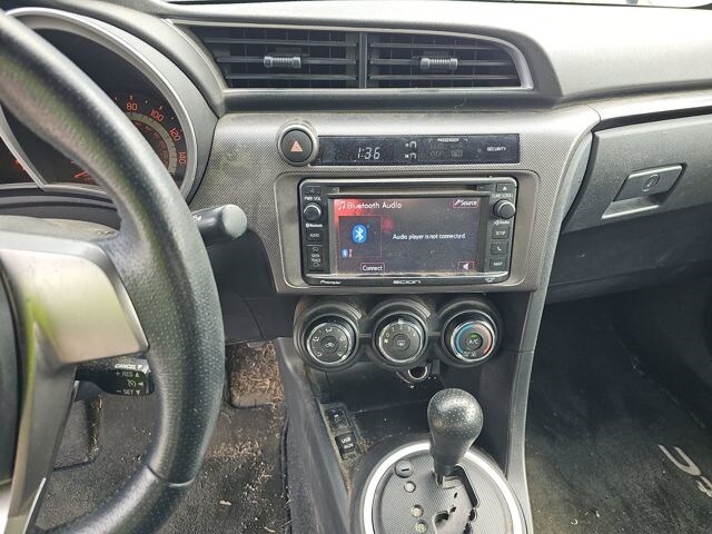 This tC is well equipped with 18" x 7.5" Aluminum Alloy Wheels, 4-Wheel Disc Brakes, 8 Speakers, ABS brakes, Air Conditioning, Alloy wheels, AM/FM radio, Anti-whiplash front head restraints, Brake assist, Bumpers: body-color, CD player, Driver door bin, Driver vanity mirror, Dual front impact airbags, Dual front side impact airbags, Electronic Stability Control, Fabric Upholstery, Four wheel independent suspension, Front anti-roll bar, Front Bucket Seats, Front Center Armrest, Front reading lights, Front Sport Bucket Seats, Illuminated entry, Knee airbag, Low tire pressure warning, Occupant sensing airbag, Outside temperature display, Overhead airbag, Panic alarm, Passenger door bin, Passenger vanity mirror, Power door mirrors, Power moonroof, Power steering, Power windows, Premium audio system: Pioneer, Radio data system, Radio: Scion Standard Audio, Rear anti-roll bar, Rear window defroster, Remote keyless entry, Speed control, Split folding rear seat, Steering wheel mounted audio controls, Tachometer, Telescoping steering wheel, Tilt steering wheel, Traction control, Turn signal indicator mirrors, and Variably intermittent wipers.