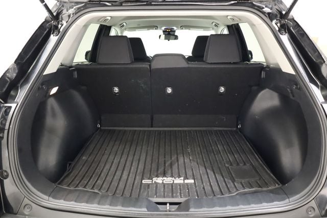 This Corolla Cross is well equipped with 17" Alloy Wheels, 4-Wheel Disc Brakes, 4.014 Axle Ratio, 6 Speakers, ABS brakes, Air Conditioning, Alloy wheels, AM/FM radio: SiriusXM, Apple CarPlay/Android Auto, Auto High-beam Headlights, Automatic temperature control, Brake assist, Bumpers: body-color, Delay-off headlights, Driver door bin, Driver vanity mirror, Dual front impact airbags, Dual front side impact airbags, Electronic Stability Control, Emergency communication system: Safety Connect with 1-year trial, Exterior Parking Camera Rear, Fabric Seat Trim, Four wheel independent suspension, Front anti-roll bar, Front Bucket Seats, Front Center Armrest, Front reading lights, Fully automatic headlights, Heated door mirrors, Illuminated entry, Knee airbag, Leather steering wheel, Low tire pressure warning, Occupant sensing airbag, Outside temperature display, Overhead airbag, Panic alarm, Passenger door bin, Passenger vanity mirror, Power door mirrors, Power steering, Power windows, Radio data system, Radio: 6 Speaker Audio, Rear anti-roll bar, Rear side impact airbag, Rear window defroster, Rear window wiper, Remote keyless entry, Roof rack: rails only, Security system, Speed control, Split folding rear seat, Spoiler, Steering wheel mounted audio controls, Tachometer, Telescoping steering wheel, Tilt steering wheel, Traction control, Trip computer, Turn signal indicator mirrors, and Variably intermittent wipers.