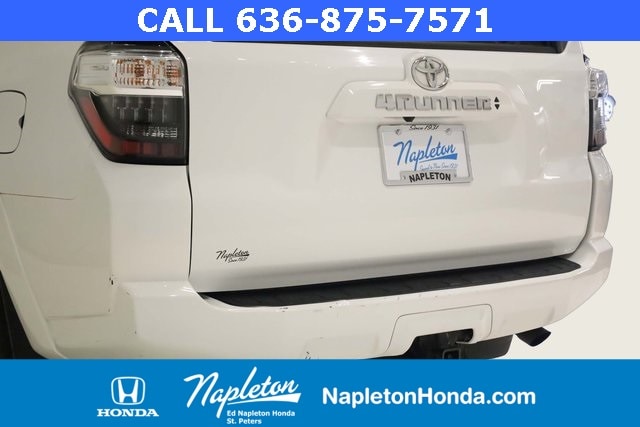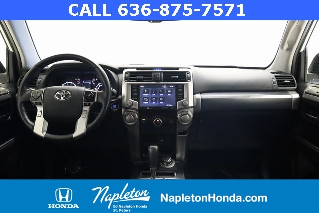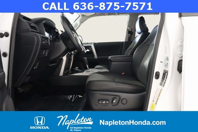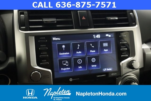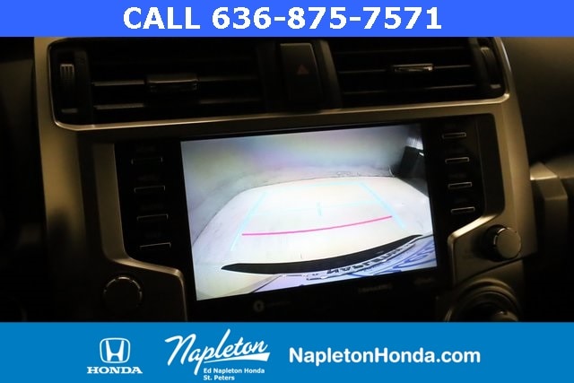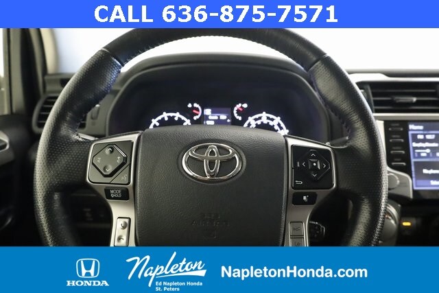 This 4Runner is well equipped with 4WD, Black/Graphite w/Leather Seat Trim, 17" 6-Spoke Alloy Wheels, 3.727 Axle Ratio, 4-Wheel Disc Brakes, 8 Speakers, ABS brakes, Air Conditioning, Alloy wheels, AM/FM radio: SiriusXM, Anti-whiplash front head restraints, Apple CarPlay/Android Auto, Auto High-beam Headlights, Auto-dimming Rear-View mirror, Brake assist, Bumpers: body-color, Compass, Driver door bin, Driver vanity mirror, Dual front impact airbags, Dual front side impact airbags, Electronic Stability Control, Emergency communication system: Safety Connect (1-year trial), Exterior Parking Camera Rear, Front anti-roll bar, Front Bucket Seats, Front Center Armrest, Front fog lights, Front reading lights, Front wheel independent suspension, Garage Door Opener, Garage door transmitter: HomeLink, Heated door mirrors, Heated Front Bucket Seats, Heated front seats, Heated Outside Rear-View Mirrors, Heated steering wheel, Illuminated entry, Knee airbag, Leather Shift Knob, Leather steering wheel, Low tire pressure warning, Navigation System, Occupant sensing airbag, Outside temperature display, Overhead airbag, Overhead console, Panic alarm, Passenger door bin, Passenger vanity mirror, Power door mirrors, Power driver seat, Power passenger seat, Power steering, Power windows, Radio: Premium Audio, Rear anti-roll bar, Rear seat center armrest, Rear window defroster, Rear window wiper, Remote keyless entry, Security system, SofTex Seat Trim, Speed control, Speed-sensing steering, Split folding rear seat, Spoiler, Steering wheel mounted audio controls, Tachometer, Telescoping steering wheel, Tilt steering wheel, Traction control, Trip computer, Turn signal indicator mirrors, and Variably intermittent wipers.