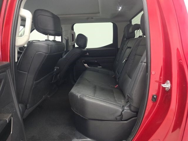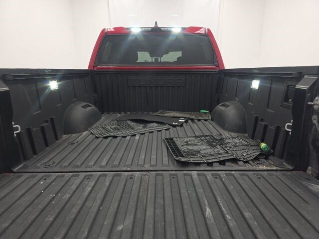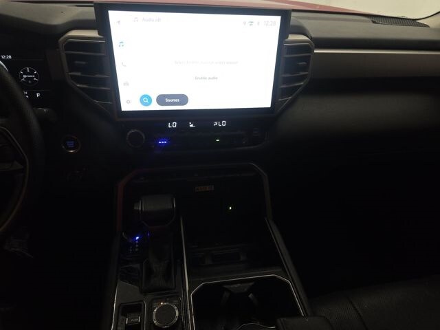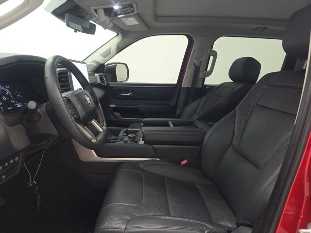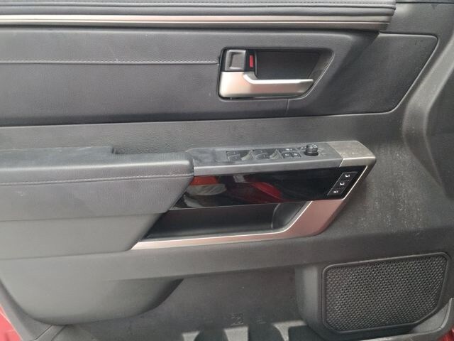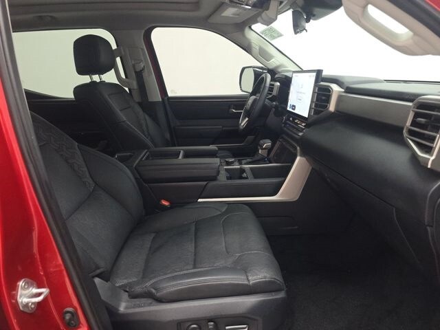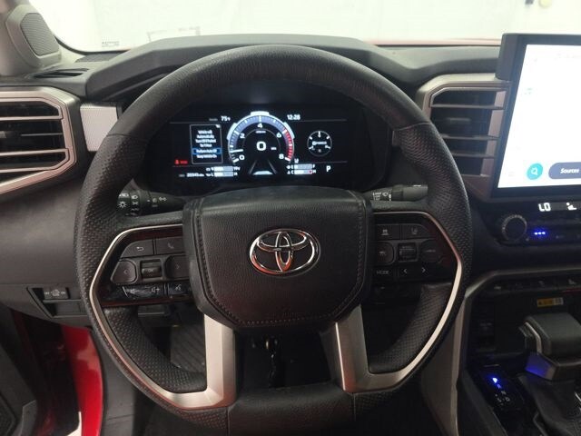 This Tundra is well equipped with 4WD, Black w/Leather Seat Trim, 20" Alloy Wheels, 3.31 Axle Ratio, 4-Wheel Disc Brakes, 8-Way Pwr Adjustable Heated/Ventilated Front Seats, 9 Speakers, ABS brakes, Air Conditioning, Alloy wheels, AM/FM radio: SiriusXM, Apple CarPlay/Android Auto, Auto High-beam Headlights, Auto-dimming door mirrors, Auto-dimming Rear-View mirror, Automatic temperature control, Brake assist, Bumpers: body-color, Delay-off headlights, Driver door bin, Driver vanity mirror, Dual front impact airbags, Dual front side impact airbags, Electronic Stability Control, Emergency communication system: Safety Connect (10-year trial), Exterior Parking Camera Rear, Front anti-roll bar, Front Bucket Seats, Front Center Armrest, Front dual zone A/C, Front fog lights, Front reading lights, Front wheel independent suspension, Fully automatic headlights, Garage door transmitter: HomeLink, Heated door mirrors, Heated front seats, Illuminated entry, Knee airbag, Leather Shift Knob, Low tire pressure warning, Memory seat, Navigation System, Occupant sensing airbag, Outside temperature display, Overhead airbag, Overhead console, Panic alarm, Passenger door bin, Passenger vanity mirror, Power door mirrors, Power driver seat, Power passenger seat, Power steering, Power windows, Radio data system, Radio: Audio Multimedia System, Rear reading lights, Rear seat center armrest, Rear step bumper, Rear window defroster, Remote keyless entry, Safety Connect, Security system, SofTex Seat Trim, Speed control, Speed-sensing steering, Split folding rear seat, Steering wheel mounted audio controls, Tachometer, Telescoping steering wheel, Tilt steering wheel, Traction control, Trip computer, Turn signal indicator mirrors, Variably intermittent wipers, Ventilated front seats, and Voltmeter.
