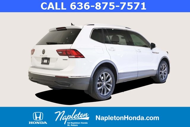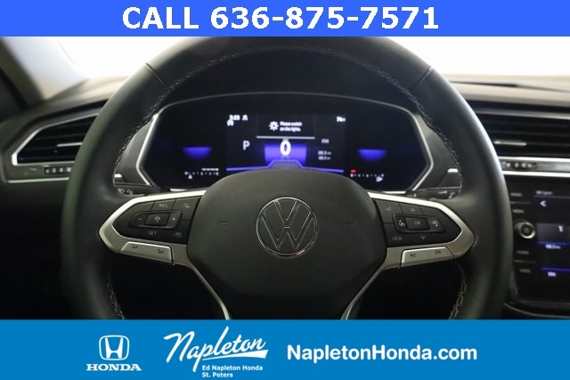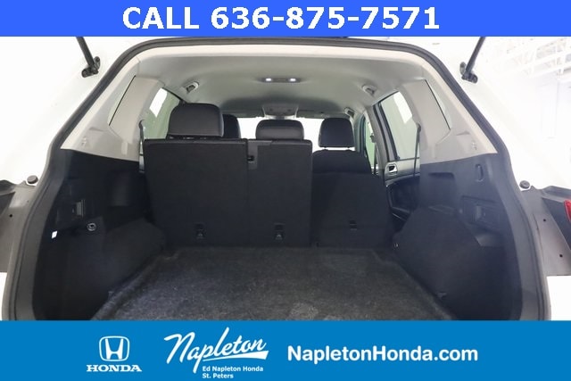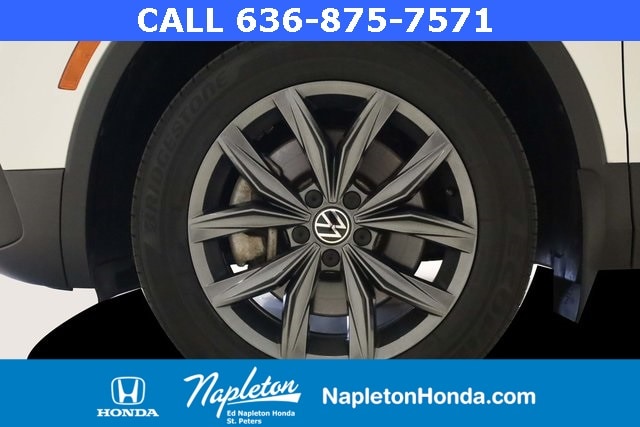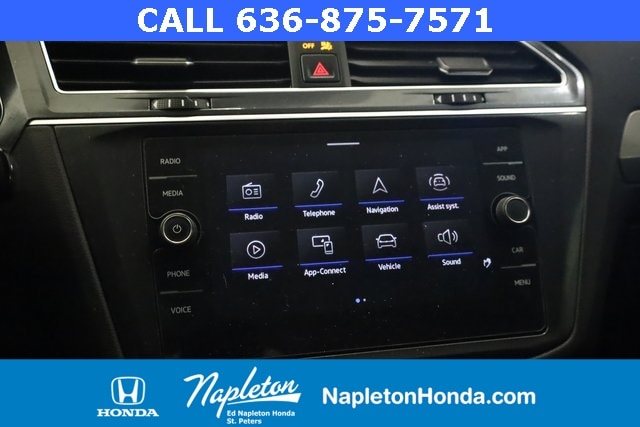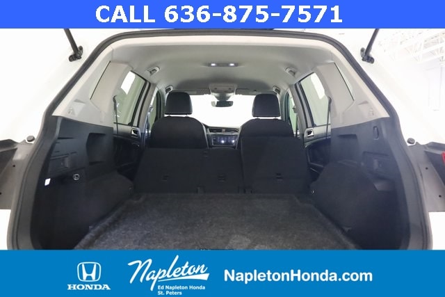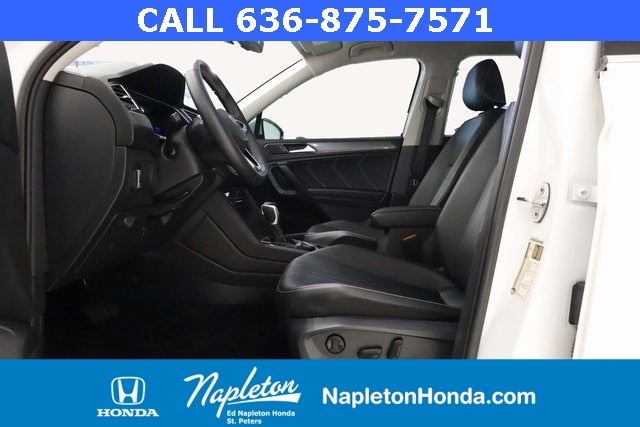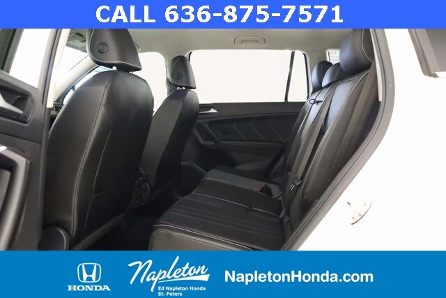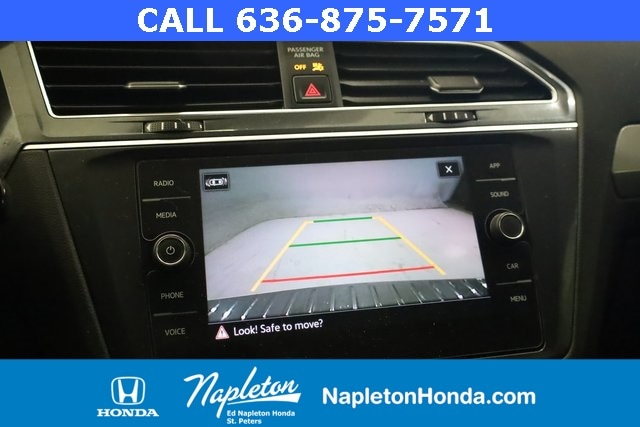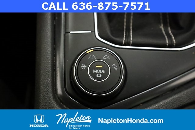 This Tiguan is well equipped with AWD, 2-Row Rubber Monster Mats w/Logo Kit (Set of 4), 3.33 Axle Ratio, 4-Wheel Disc Brakes, 4-Wheel Independent Suspension, 6 Speakers, ABS brakes, Air Conditioning, Alloy wheels, AM/FM radio: SiriusXM with 360L, Auto-Dimming Rear-View Mirror, Auto-dimming Rear-View mirror, Automatic temperature control, Brake assist, Bumpers: body-color, Compass, Delay-off headlights, Driver door bin, Driver vanity mirror, Dual front impact airbags, Dual front side impact airbags, Electronic Stability Control, Emergency communication system: Car-Net, Exterior Parking Camera Rear, First Aid Kit, Four wheel independent suspension, Front anti-roll bar, Front Bucket Seats, Front Center Armrest, Front dual zone A/C, Front reading lights, Fully automatic headlights, Heated door mirrors, Heated Front Comfort Seats, Heated front seats, Heavy Duty Trunk Liner w/VW CarGo Blocks, Illuminated entry, Leather Shift Knob, Low tire pressure warning, Occupant sensing airbag, Outside temperature display, Overhead airbag, Overhead console, Panic alarm, Passenger door bin, Passenger vanity mirror, Perforated V-Tex Leatherette Seating Surfaces, Power door mirrors, Power driver seat, Power Liftgate, Power Rear Liftgate Delete, Power steering, Power windows, Radio data system, Radio: MIB3 Composition Media AM/FM/HD, Rain sensing wipers, Rear anti-roll bar, Rear reading lights, Rear seat center armrest, Rear Sensors Delete, Rear window defroster, Rear window wiper, Remote keyless entry, Roadside Assistance Kit, Roof rack: rails only, Security system, Speed control, Speed-sensing steering, Split folding rear seat, Spoiler, Steering wheel mounted audio controls, Tachometer, Telescoping steering wheel, Tilt steering wheel, Traction control, Trip computer, Turn signal indicator mirrors, Variably intermittent wipers, VW Care, and Wheels: 18" Dark Graphite 10-Spoke Alloy.