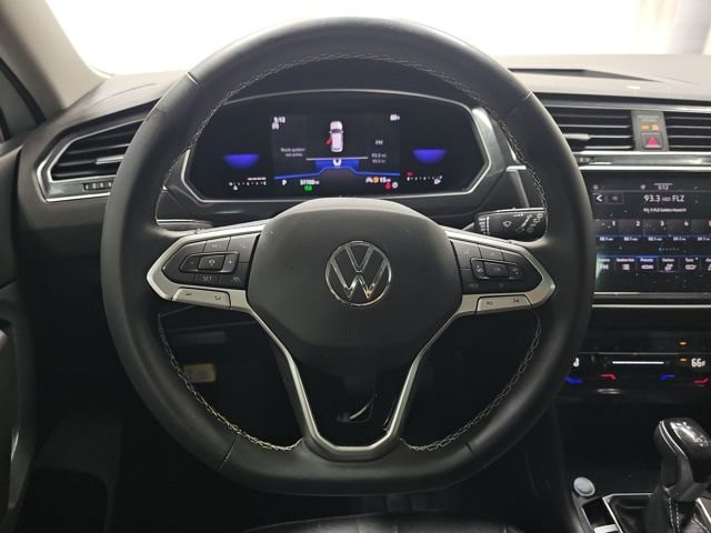 This Tiguan is well equipped with 3.33 Axle Ratio, 3rd row seats: bench, 4-Wheel Disc Brakes, 4-Wheel Independent Suspension, 6 Speakers, ABS brakes, Air Conditioning, Alloy wheels, AM/FM radio: SiriusXM with 360L, Auto-dimming Rear-View mirror, Automatic temperature control, Brake assist, Bumpers: body-color, Compass, Delay-off headlights, Driver door bin, Driver vanity mirror, Dual front impact airbags, Dual front side impact airbags, Electronic Stability Control, Emergency communication system: Car-Net, Exterior Parking Camera Rear, Four wheel independent suspension, Front anti-roll bar, Front Bucket Seats, Front Center Armrest, Front dual zone A/C, Front reading lights, Fully automatic headlights, Heated door mirrors, Heated Front Comfort Seats, Heated front seats, Illuminated entry, Leather Shift Knob, Low tire pressure warning, Occupant sensing airbag, Outside temperature display, Overhead airbag, Overhead console, Panic alarm, Passenger door bin, Passenger vanity mirror, Perforated V-Tex Leatherette Seating Surfaces, Power door mirrors, Power driver seat, Power Liftgate, Power steering, Power windows, Radio data system, Radio: MIB3 Composition Media AM/FM/HD, Rain sensing wipers, Rear anti-roll bar, Rear reading lights, Rear seat center armrest, Rear window defroster, Rear window wiper, Remote keyless entry, Roof rack: rails only, Security system, Speed control, Speed-sensing steering, Split folding rear seat, Spoiler, Steering wheel mounted audio controls, Tachometer, Telescoping steering wheel, Tilt steering wheel, Traction control, Trip computer, Turn signal indicator mirrors, Variably intermittent wipers, and Wheels: 18" Dark Graphite 10-Spoke Alloy.
