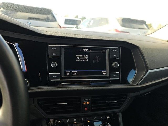This Jetta is well equipped with Titan Black w/V-Tex Leatherette Seat Trim, 4 Speakers, 4-Wheel Disc Brakes, ABS brakes, Active Blind Spot Monitor, Air Conditioning, Alloy wheels, Auto-dimming Rear-View mirror, Automatic temperature control, Brake assist, Bumpers: body-color, Delay-off headlights, Driver door bin, Driver vanity mirror, Dual front impact airbags, Dual front side impact airbags, Electronic Stability Control, Emergency communication system: VW Car-Net Safe & Secure 5-year, Exterior Parking Camera Rear, Front anti-roll bar, Front Bucket Seats, Front Center Armrest, Front dual zone A/C, Front wheel independent suspension, Fully automatic headlights, Heated door mirrors, Heated Front Seats, Heated front seats, Illuminated entry, Leather Shift Knob, Leather steering wheel, Low tire pressure warning, Occupant sensing airbag, Outside temperature display, Overhead airbag, Overhead console, Panic alarm, Passenger door bin, Passenger vanity mirror, Power door mirrors, Power driver seat, Power steering, Power windows, Radio data system, Radio: MIB3 Composition Color w/6.5" Touchscreen, Rain sensing wipers, Rear anti-roll bar, Rear reading lights, Rear seat center armrest, Rear window defroster, Remote keyless entry, Speed control, Speed-sensing steering, Split folding rear seat, Steering wheel mounted audio controls, Tachometer, Telescoping steering wheel, Tilt steering wheel, Traction control, Trip computer, V-Tex Leatherette Seat Trim, Variably intermittent wipers, and Wheels: 17" Twin 5-Spoke Silver Painted Alloy.